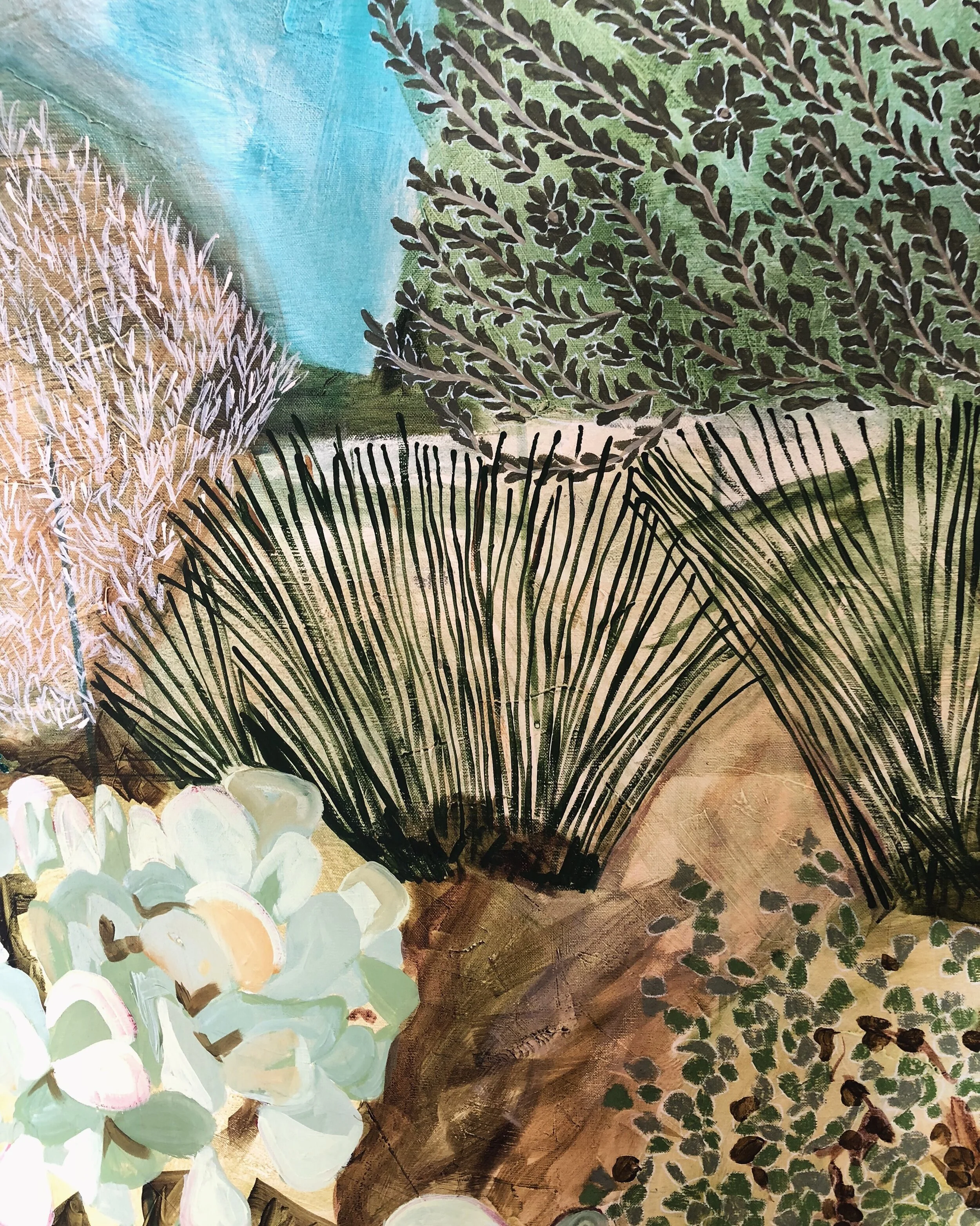 “My collection of work for this show aims to evoke these feelings while capturing the essence of the unique coastal country landscape of Point Lonsdale,” she shares. “From the gnarly Moonah Tree Forrest which frames the sprawling property to the gorgeous banksias and succulents taking pride of place at the entrance of the luxury retreat.”