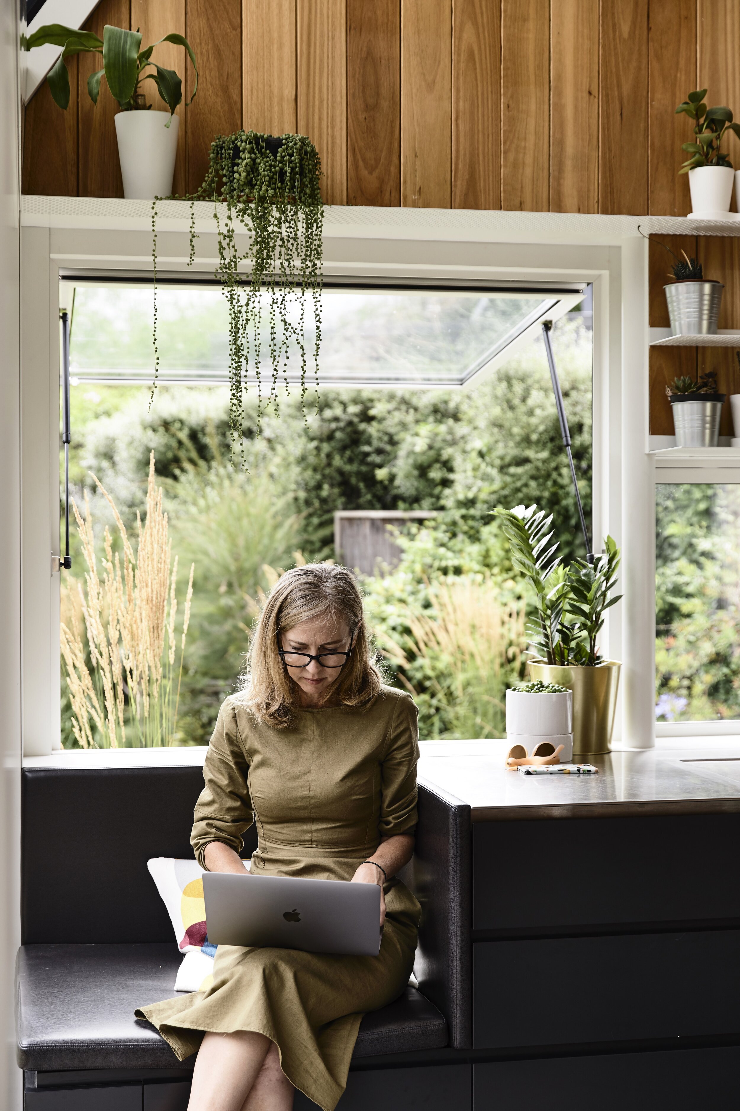 Throughout the colder months the sun streams in through the north facing windows, heating the concrete slab which continues to radiate warmth well into the night. Photo - Derek Swalwell.