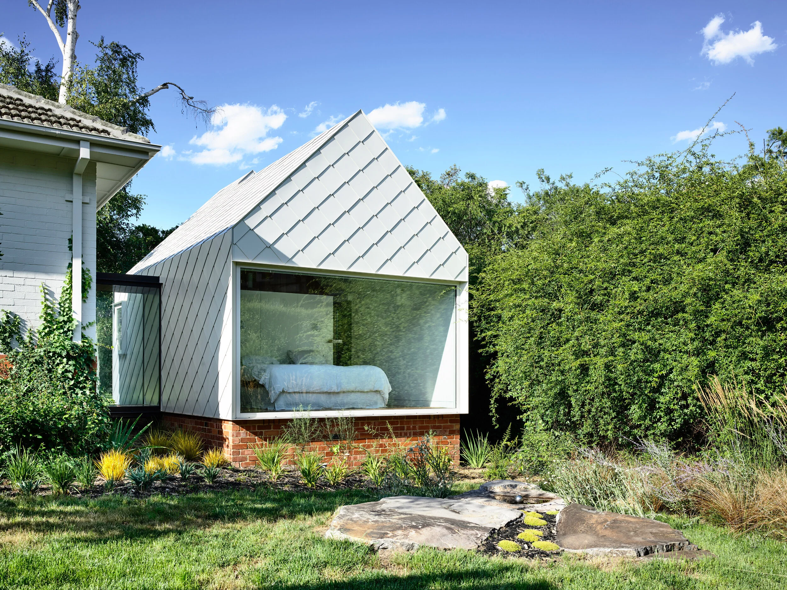 The master bedroom pavilion respects the character of the existing house, and also creates a distinctly contemporary piece of architecture. Photo - Derek Swalwell.
