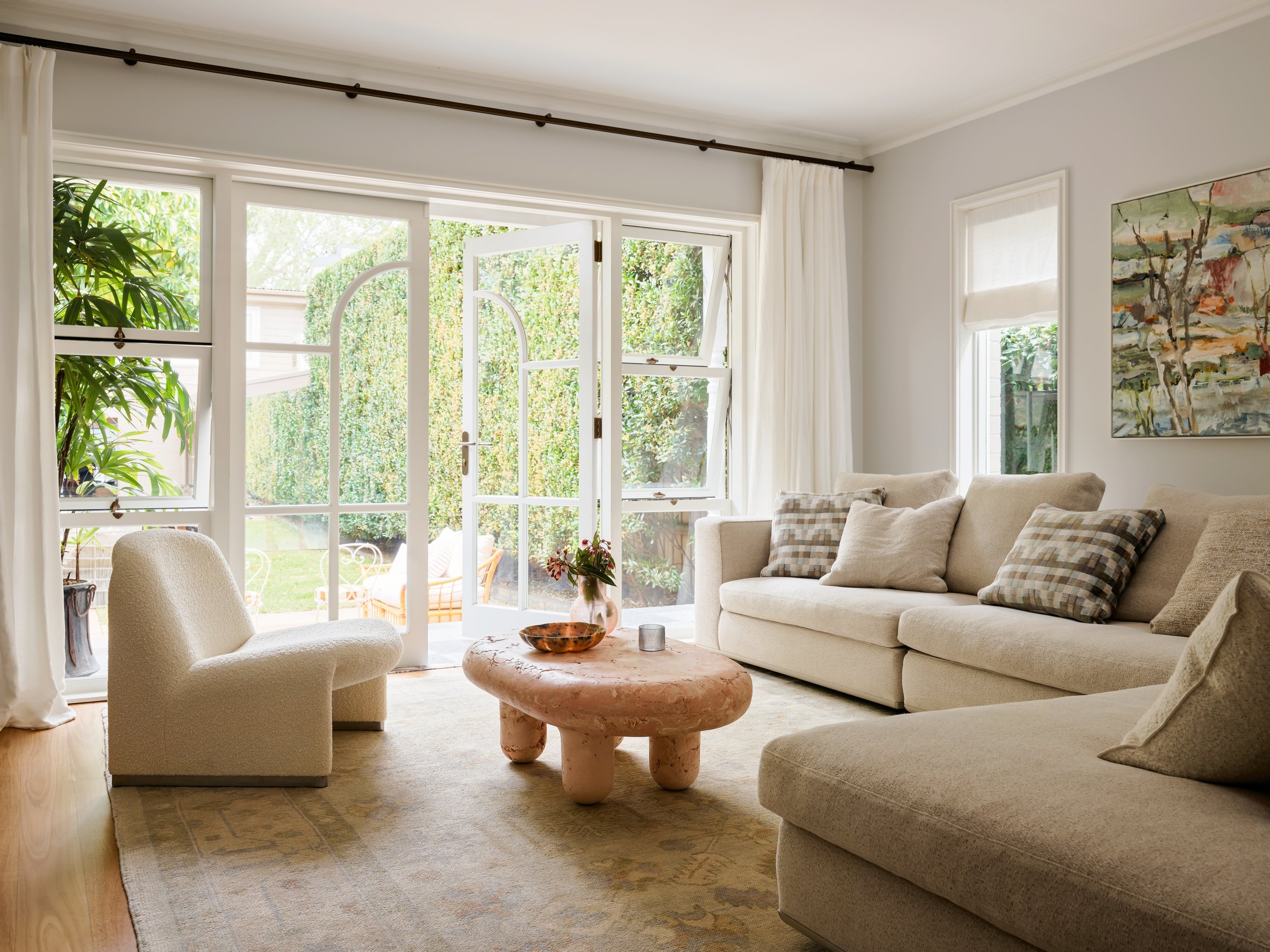 Light, welcoming tones feature in the furnishings here, and the space flows into the backyard through more French doors. Curves come courtesy of a television cabinet with a wave motif and a salmon-coloured sculptural table of reclaimed clay that has so much character you can almost picture it following the owner around the house on its robust legs.