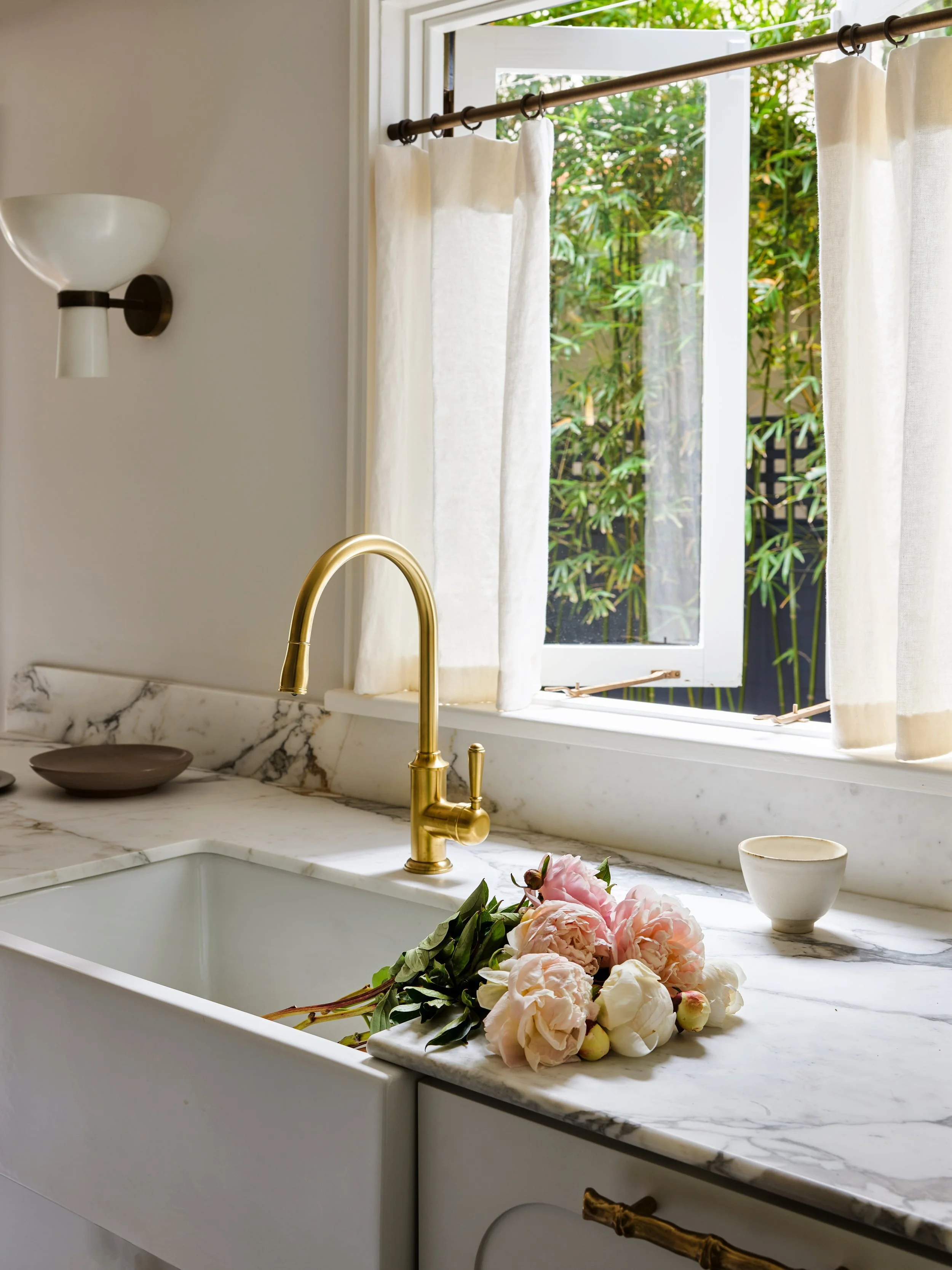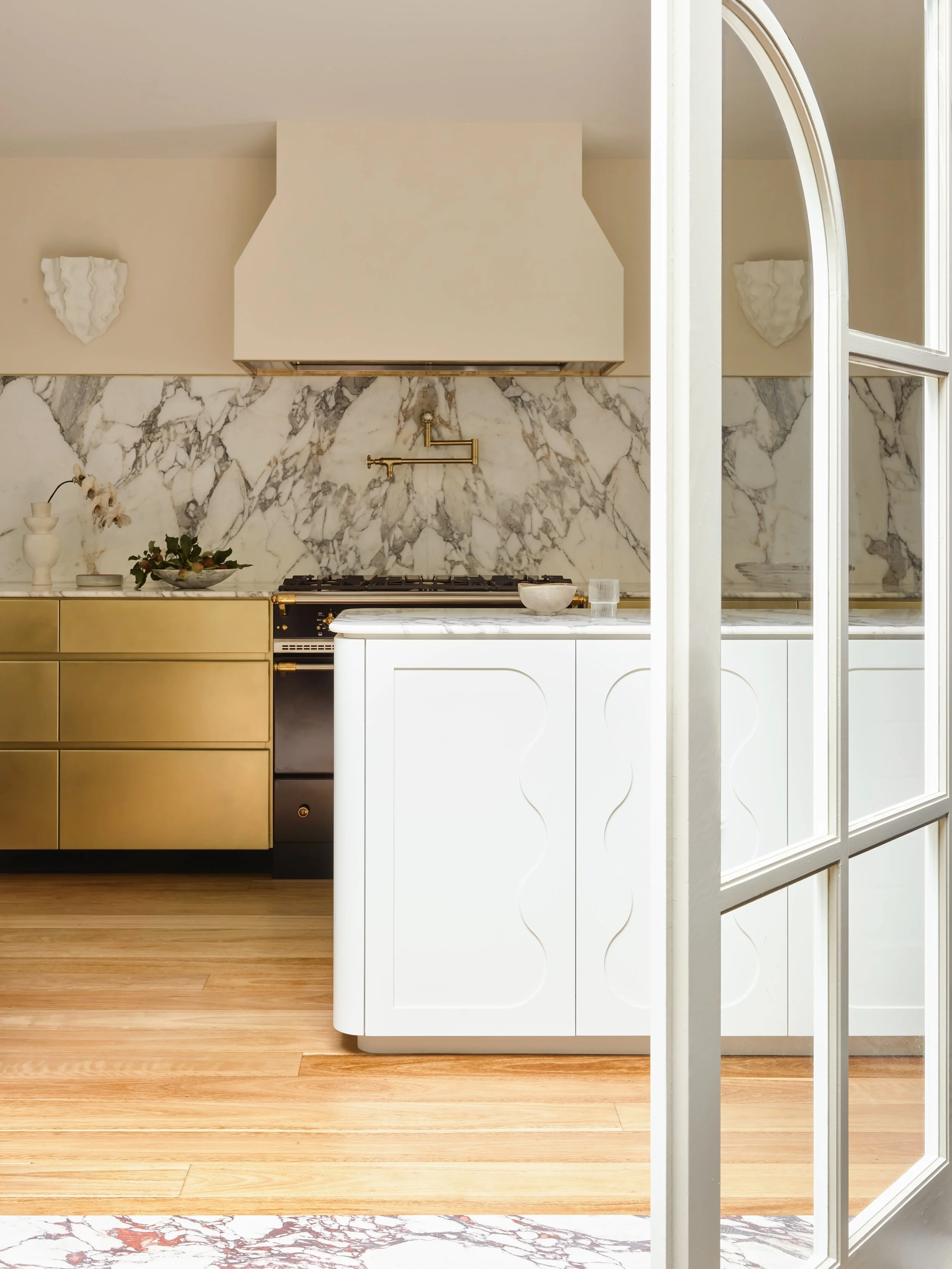 Downstairs, more whimsical waves appear in a relief pattern on the kitchen island cabinets and are echoed in the defined arch details of the French doors – a romantic element we introduced to connect this room to the internal courtyard. With the curves and a mix of materials that includes sage green cabinets, grey marble benchtops and brushed brass drawers, the kitchen is a classical room with a feminine twist. Some deft spatial manipulation, including the removal of a large column, allowed us to open the sink area to the courtyard and transform this narrow space into a light-filled room that appears larger than it actually is.