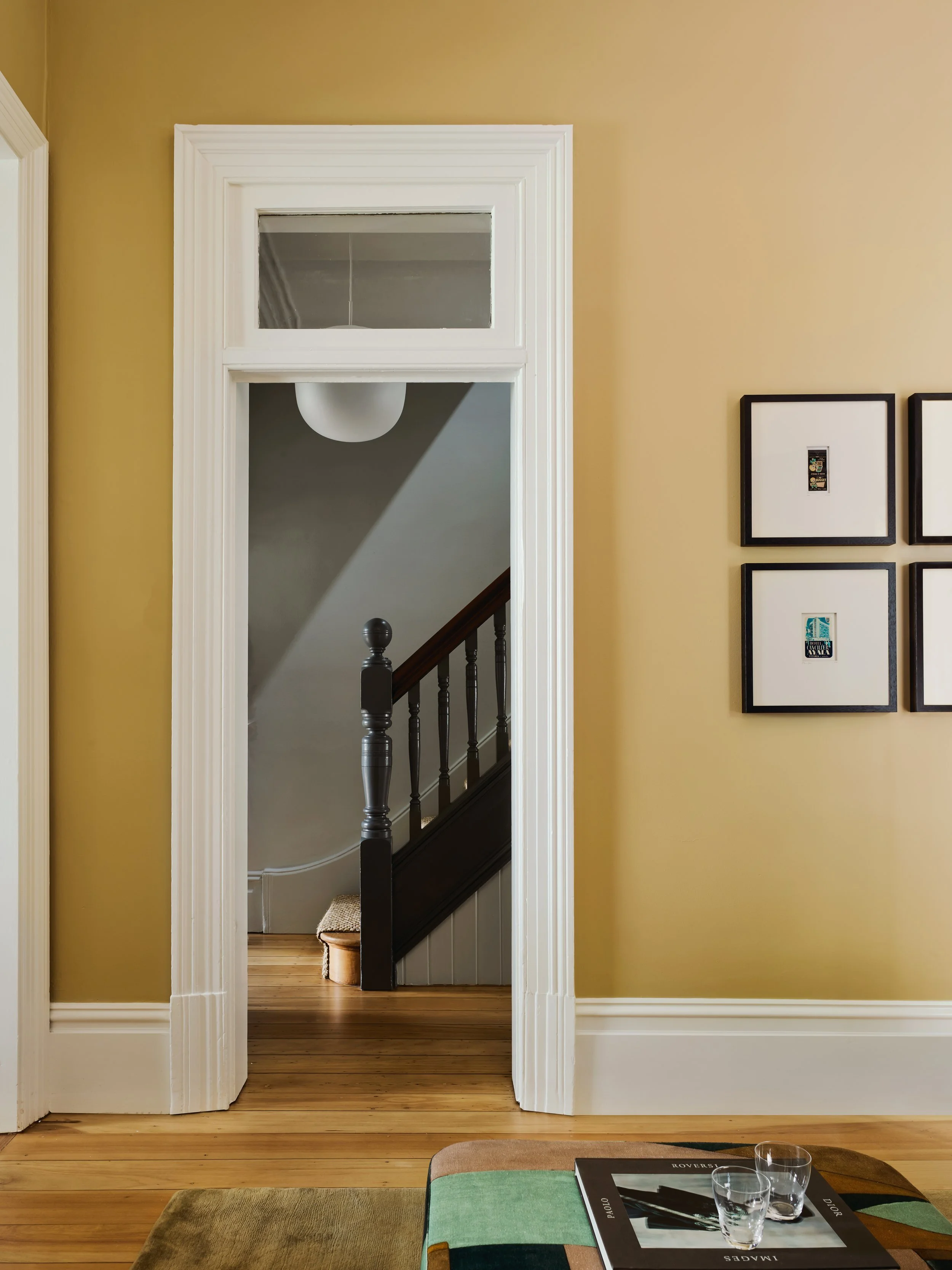 As we designed these intimate spaces, we also had in mind the house’s role as a hub for extended family. This is where the terrace’s typical front formal living and dining rooms come into play, with the vintage dining table the scene of many gatherings. There is a lovely progression through these two spaces to reach the kitchen and courtyard, which is enriched by the connection of colours between the rooms and the hallway beyond.