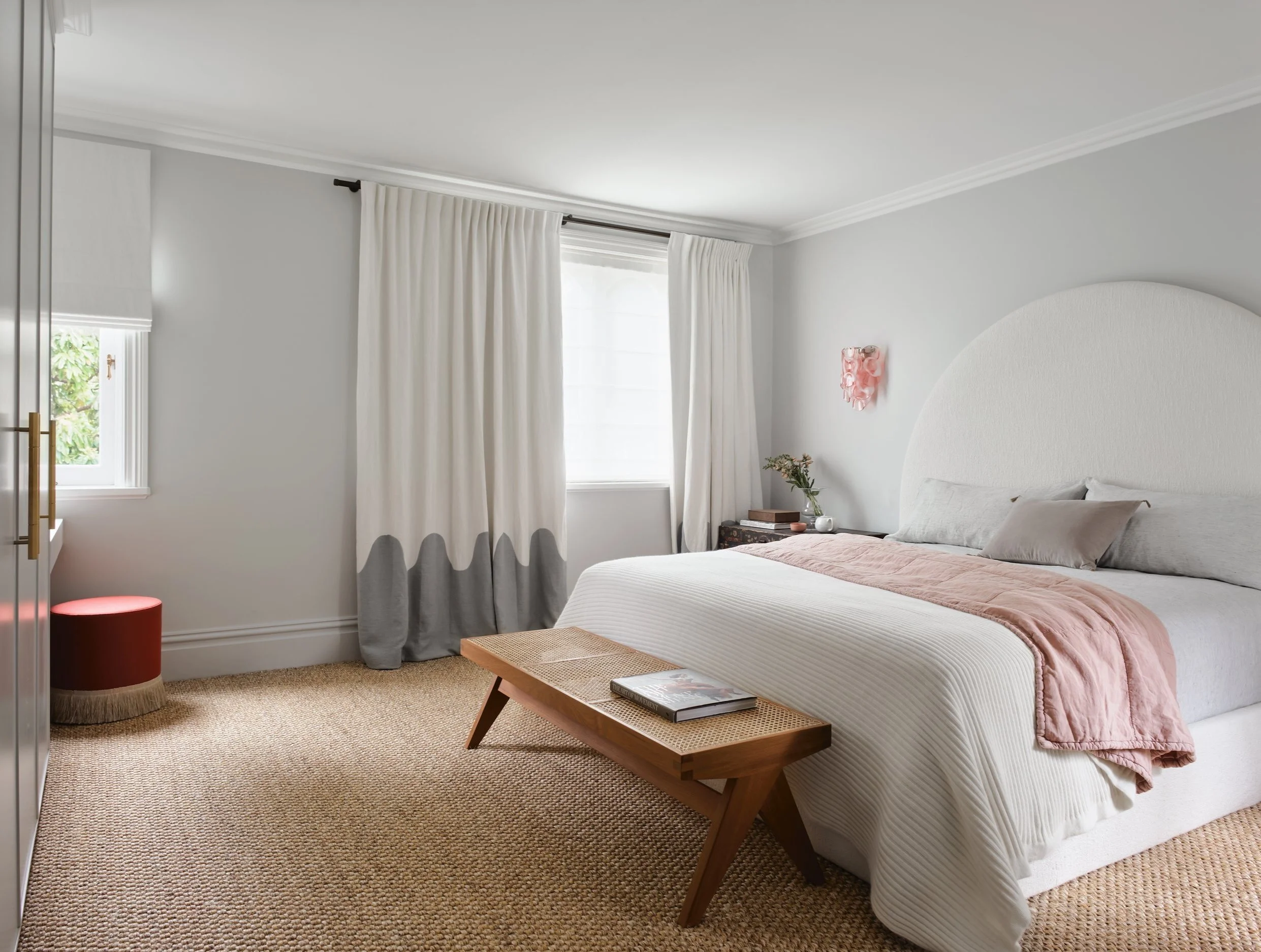 There is a pared-back delicacy to the master bedroom that evokes a wonderful sense of calmness and is attuned to a softly feminine quality. This is enhanced by the delectable vintage pink Murano glass wall sconces and some unexpected custom curves that we introduced throughout the house. On the ivory bouclé bedhead, the generous arch visually enlarges the room; on the linen curtains, the wave motif brings a serene sense of fluidity.