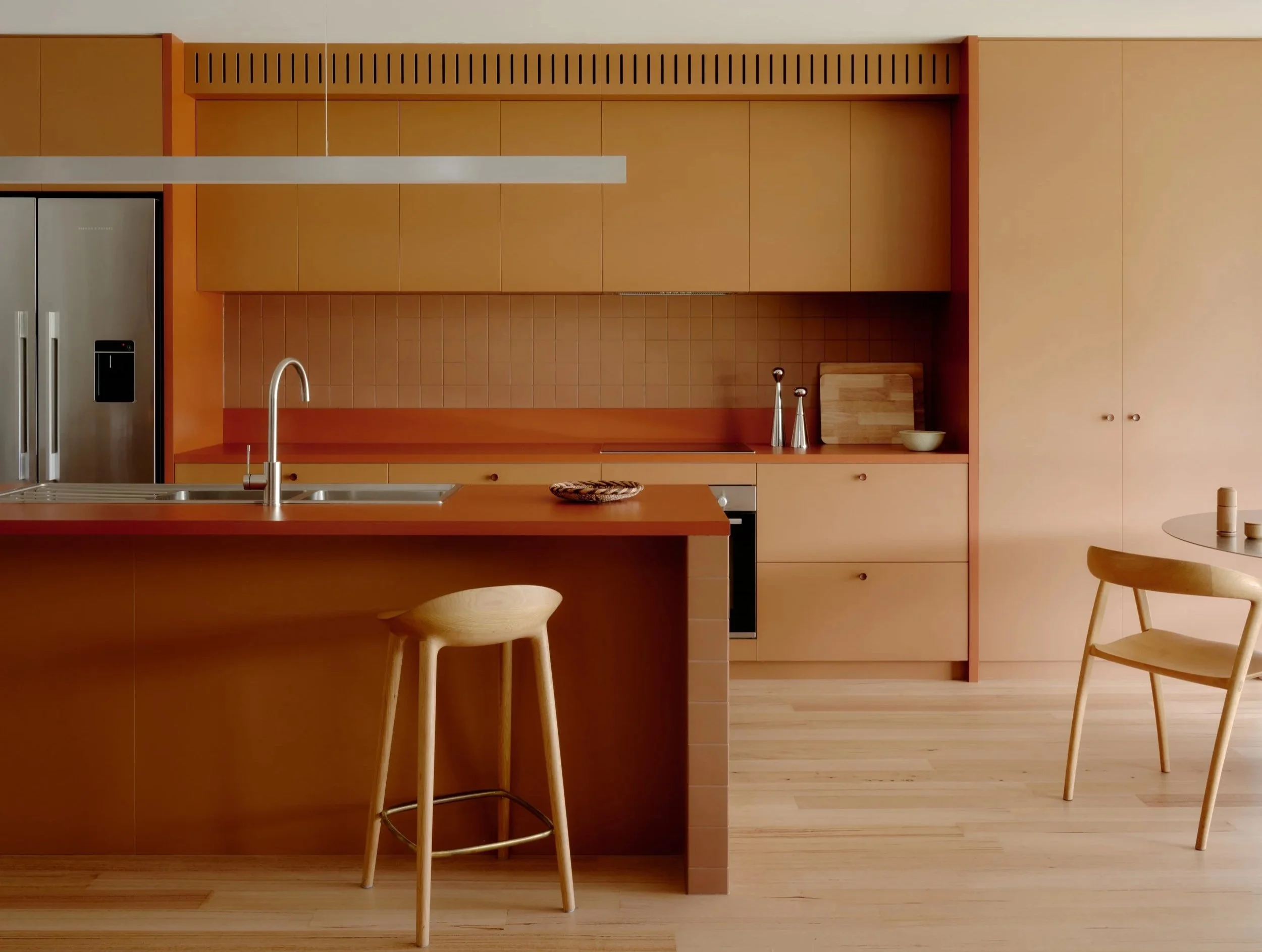 The open living and kitchen space features Moroccan Clay and Burnt Ochre, warm timber and a tiled island for relaxed weekend living.