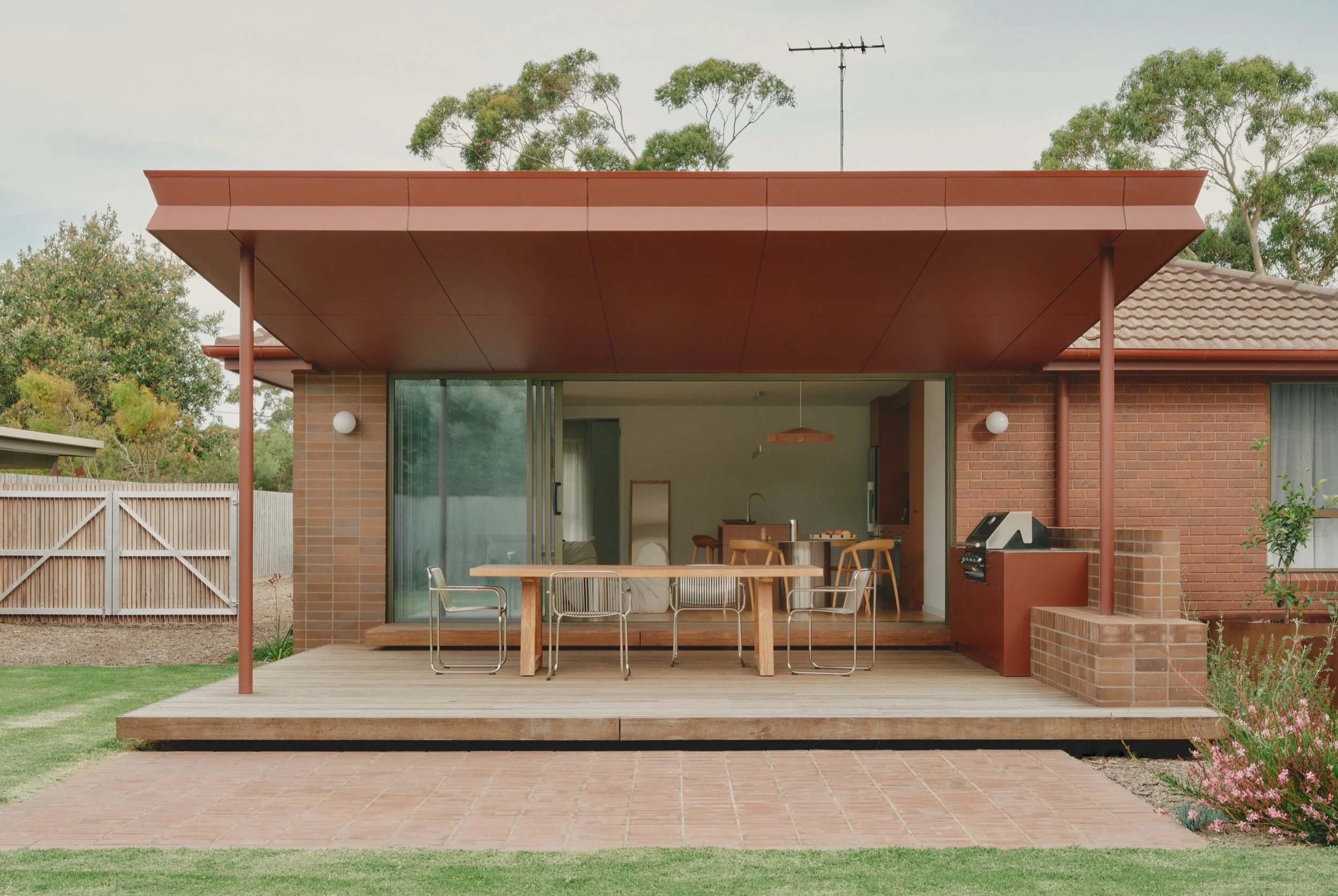 Materially, the project carries a warmth that draws from the existing structure without replicating it. Laminex became a key material throughout for its durability and tonal depth, with Moroccan Clay and Burnt Ochre introducing a grounded richness that sits comfortably against the red-brown brick. The exterior palette moves inward with a sense of restraint — the result feeling robust yet considered, suited to sandy feet, long lunches and the informality of a weekend away.