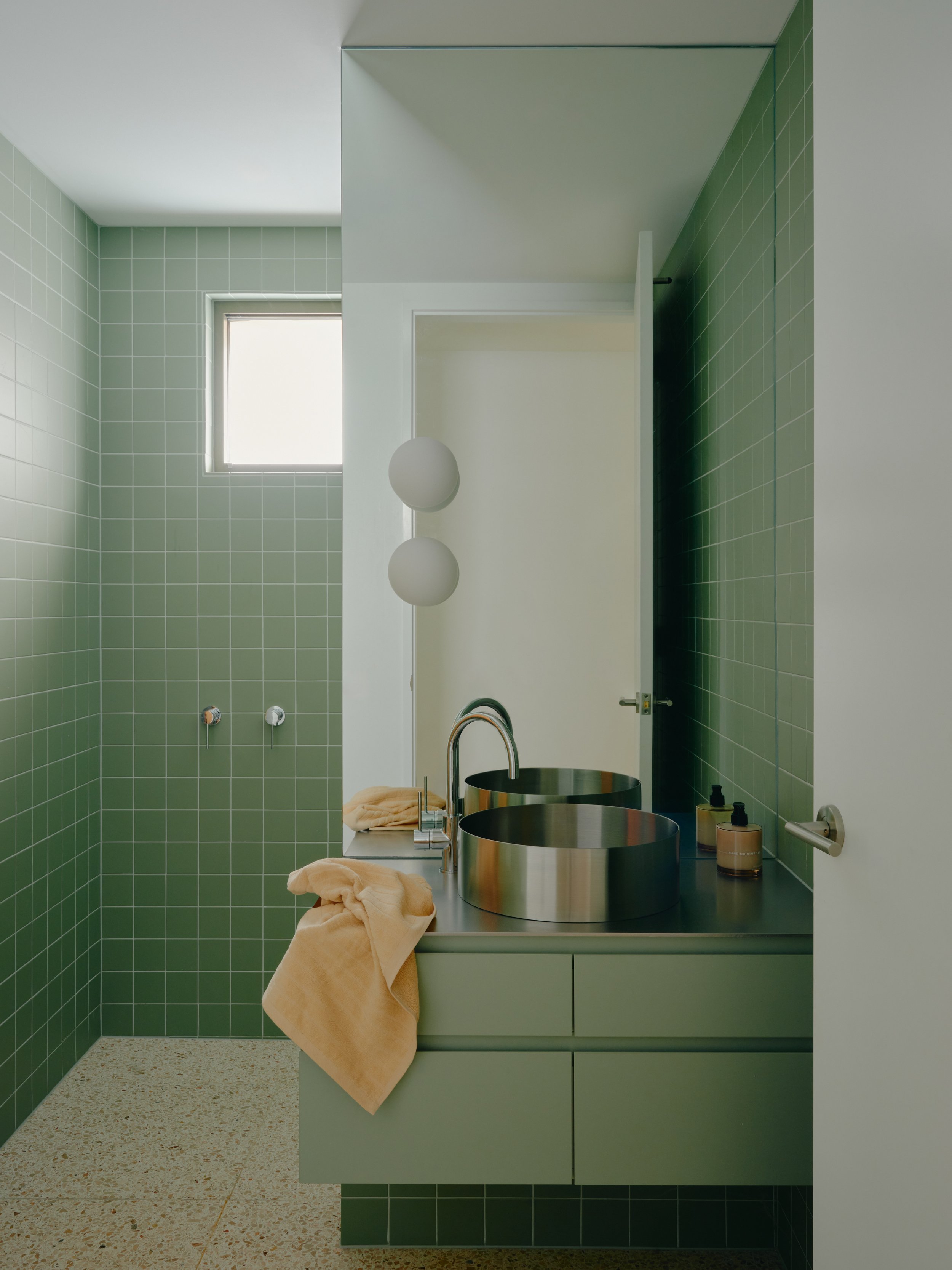 Bathroom joinery in Laminex Bayleaf Natural and Sage Tessellated Tiles from Di Fazio.