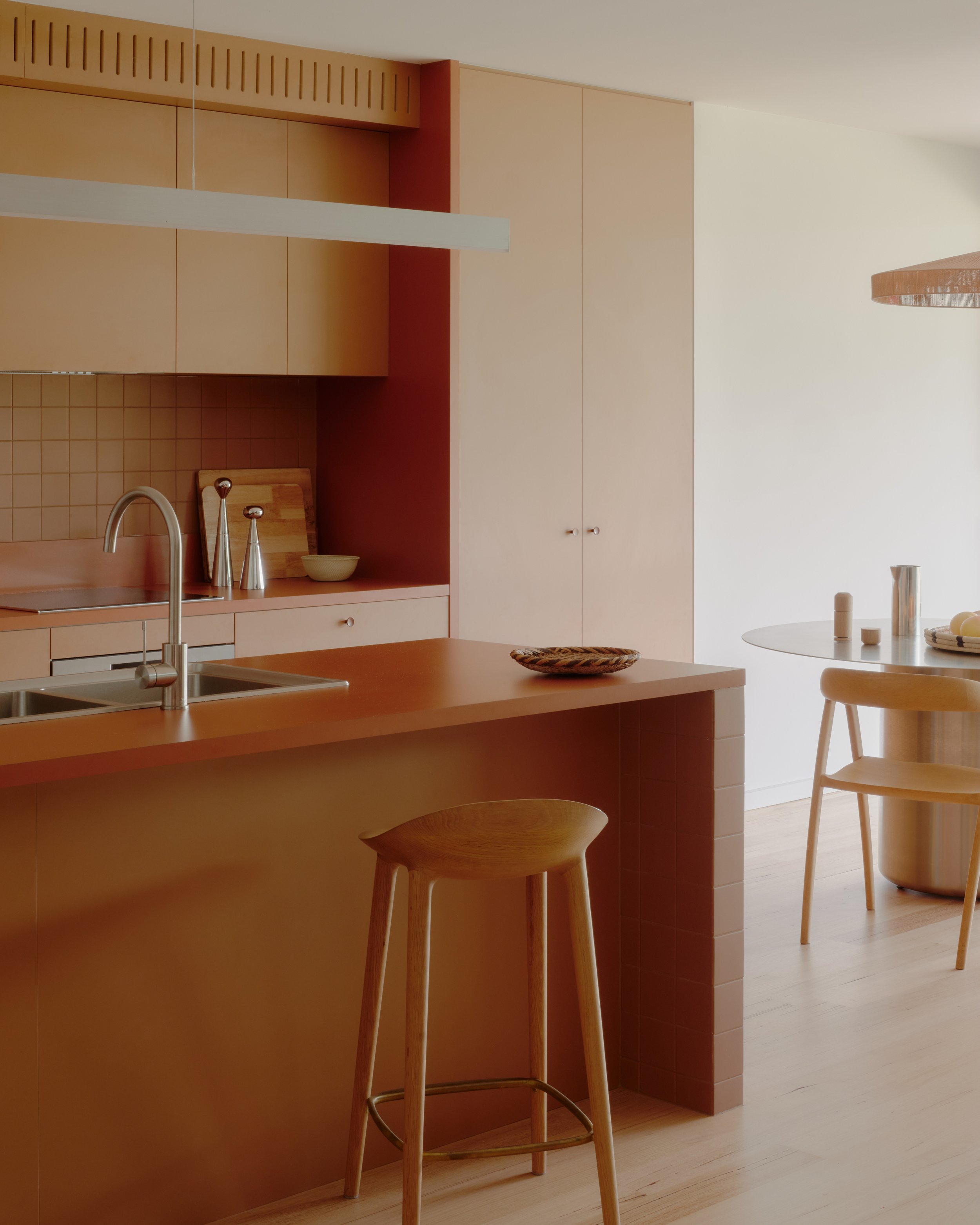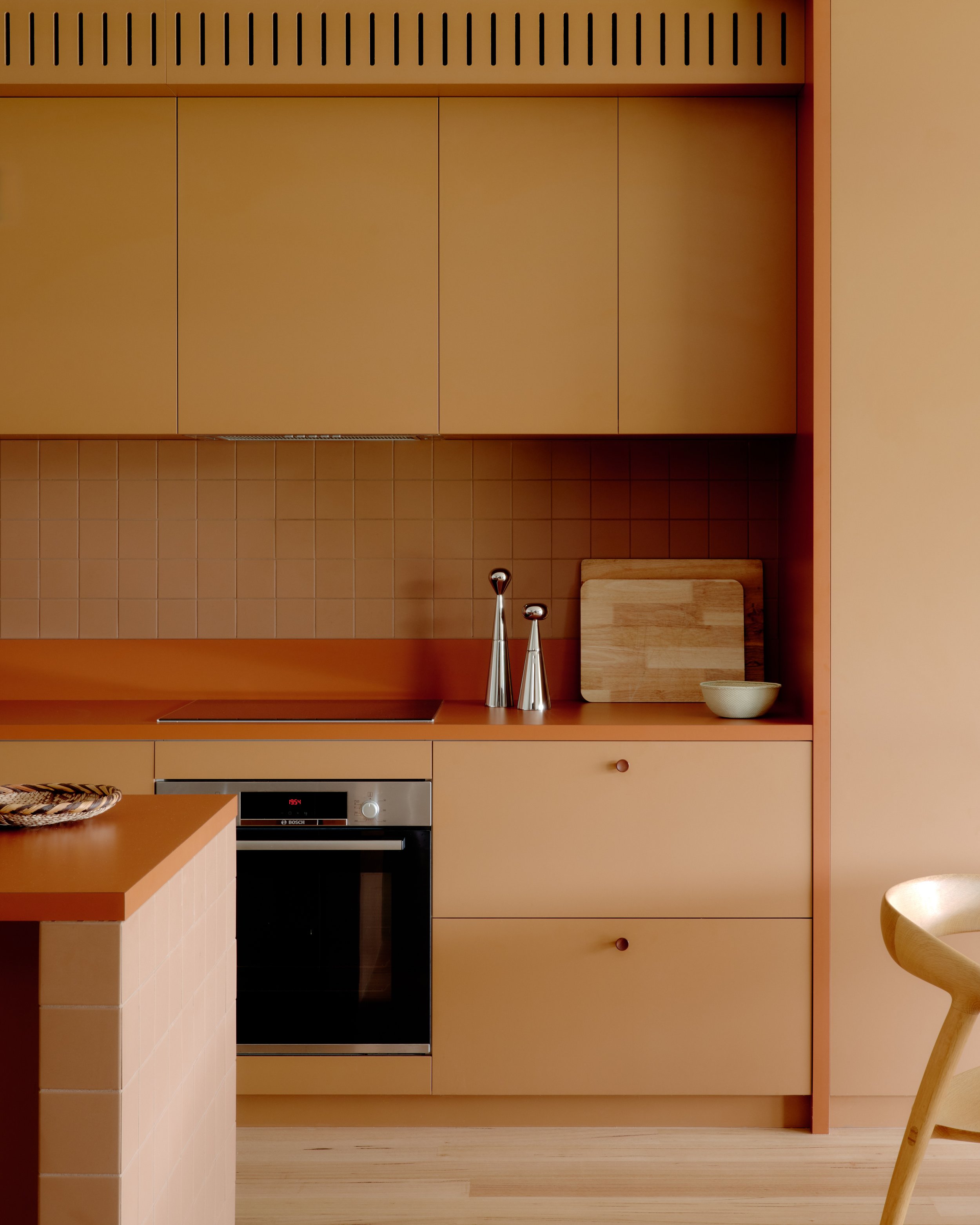 In the kitchen Laminex Burnt Ochre Natural grounds the space.