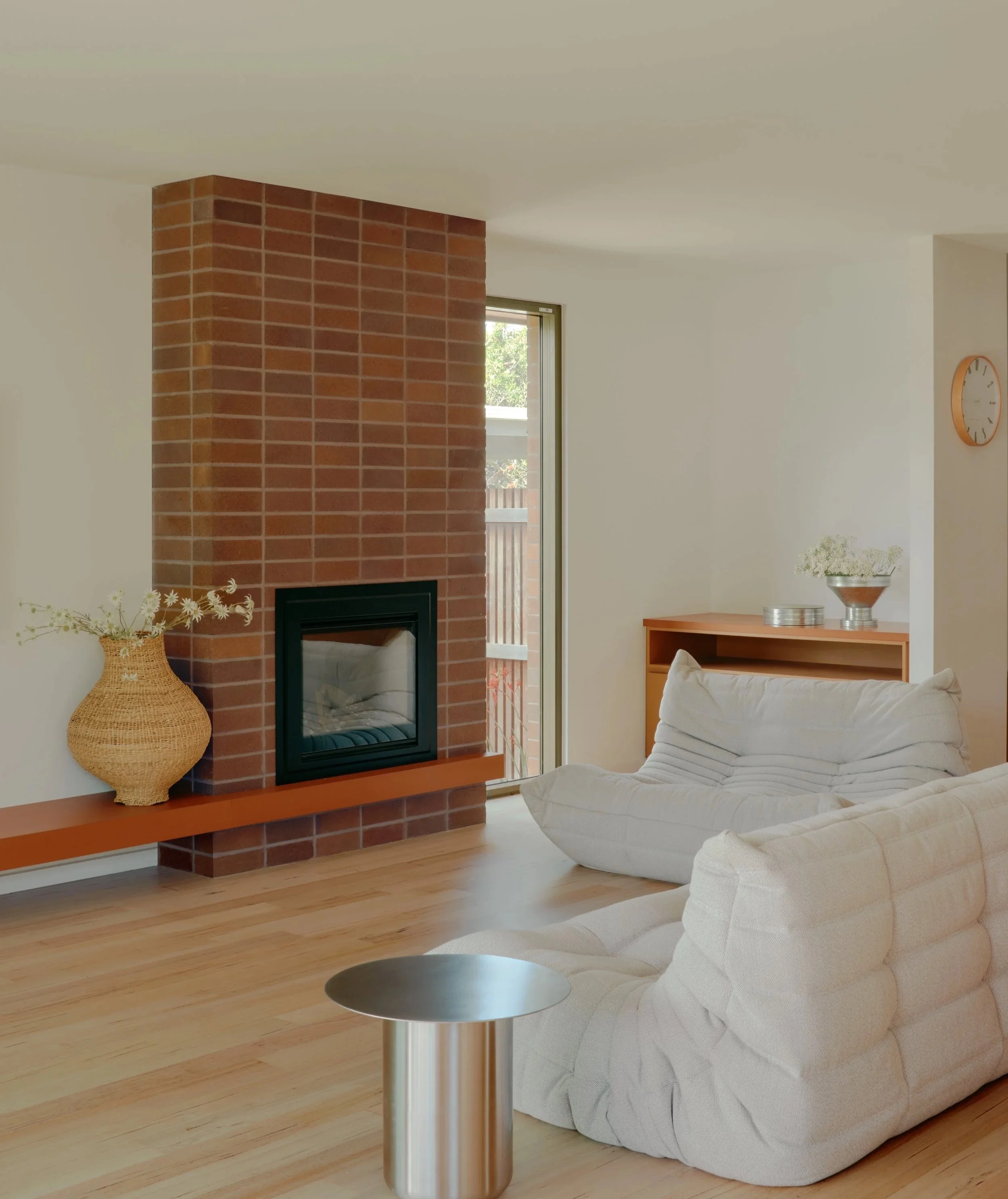 A full-height brick fireplace becomes the focal point of the living room, its Burnt Ochre hearth and stack-bond detail echoing the material language of the home.