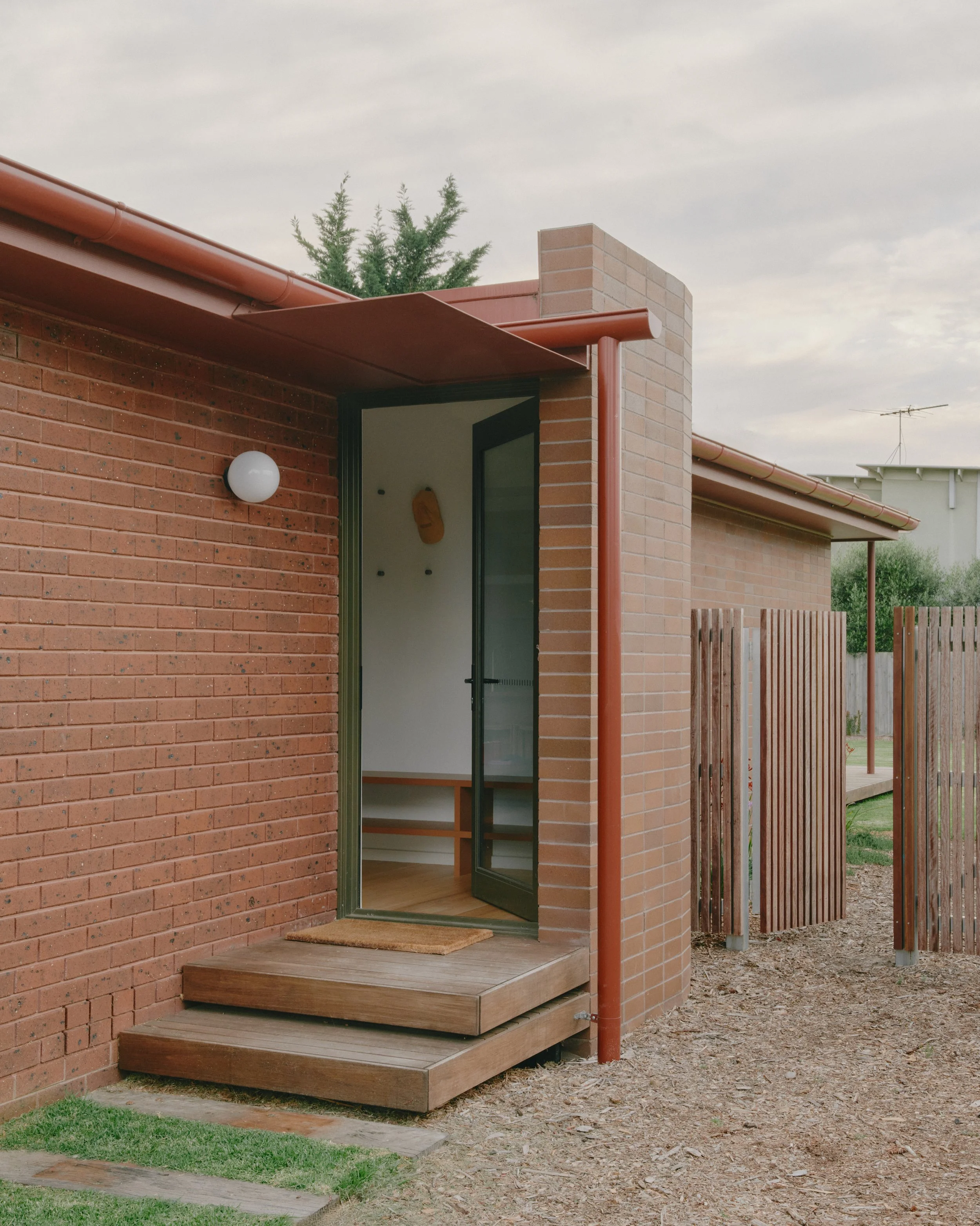The new entry to the northern side, where timber, brick and a careful palette of Manor Red offer the first hint of the detail that carries throughout.