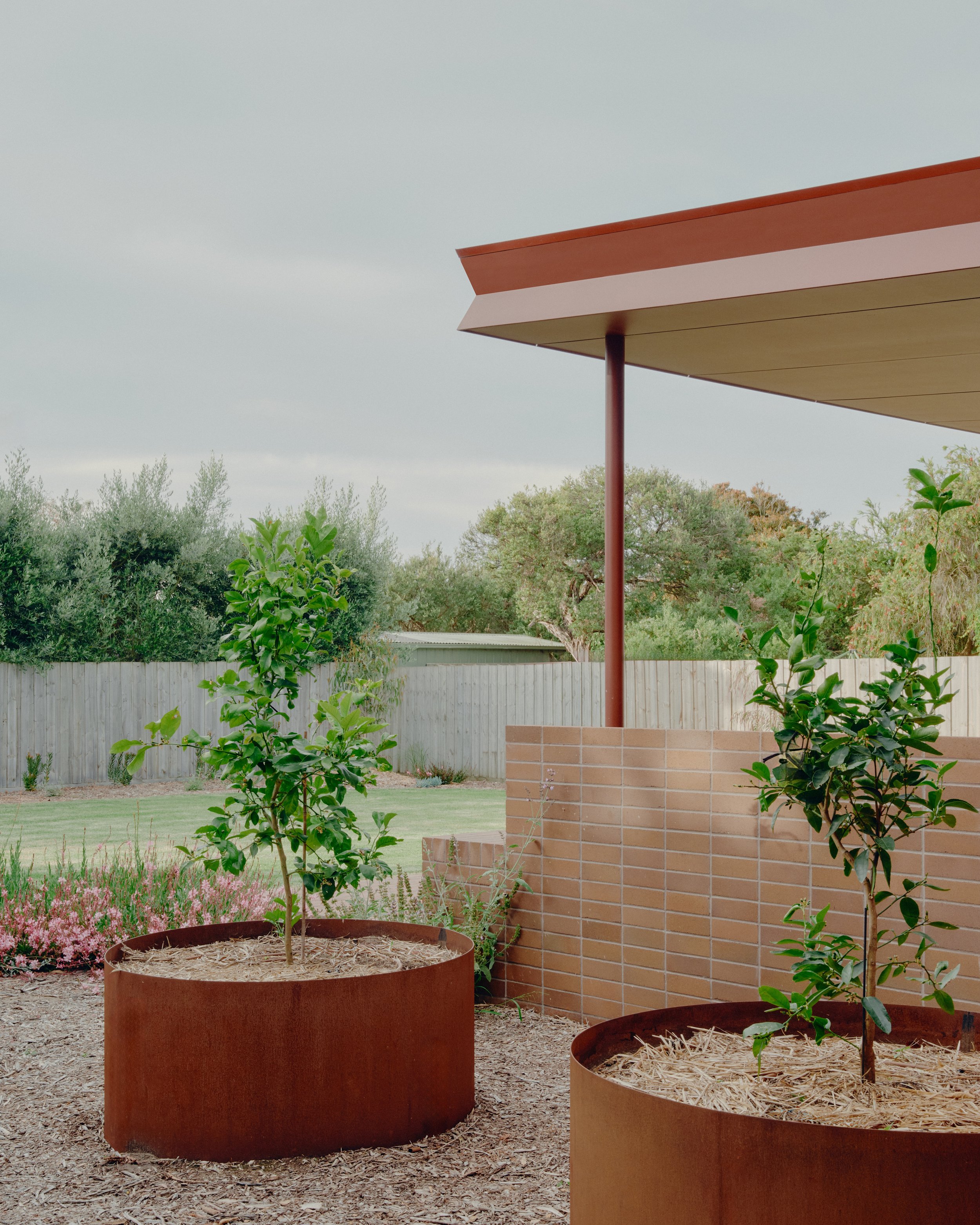 Outside, Corten steel planters anchor the garden as young citrus trees take hold — rust and brick, the palette extending beyond the walls.