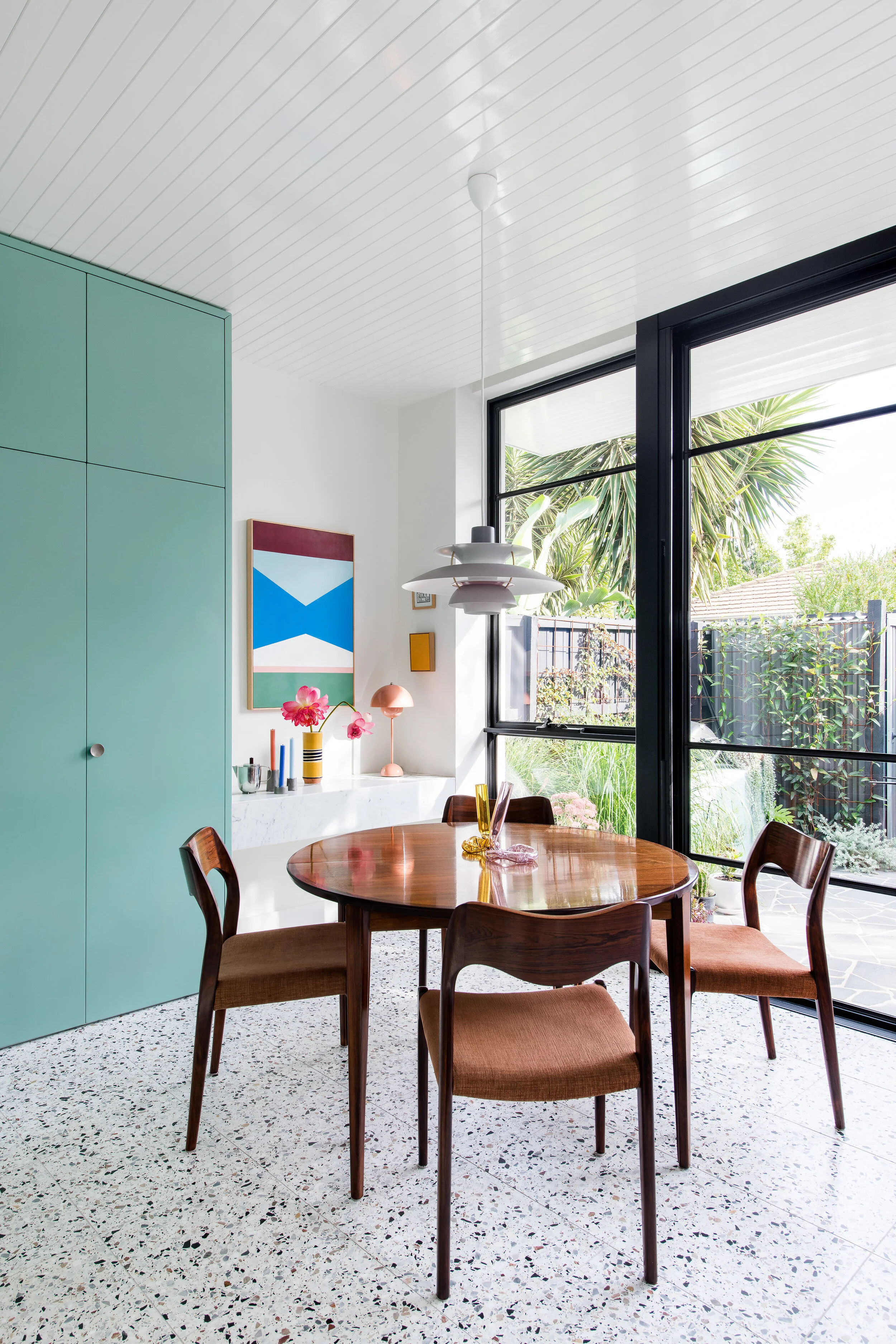 Mid century details in the light-filled dining space. Photo: Cathy Schusler. Styling: Natalie James