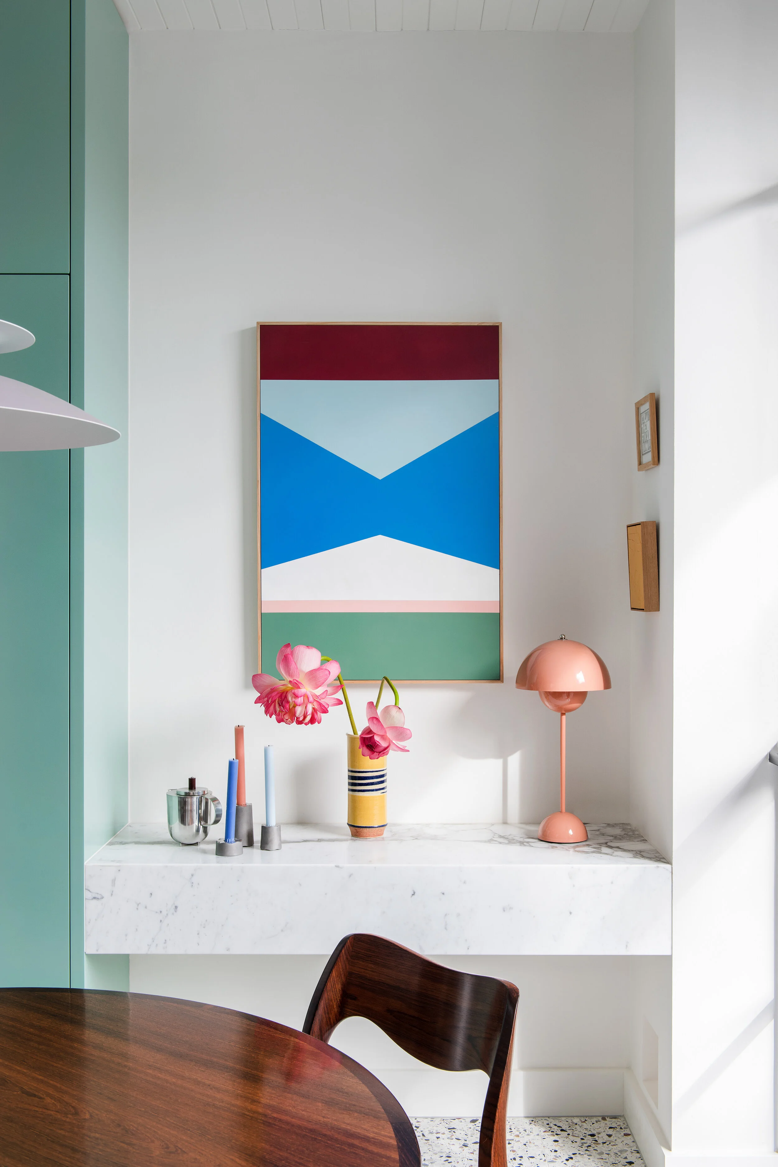 ‘We used the mint colour of the original kitchen as inspiration, which was still in place after all these years, and adjusted the shade to work with the other interior finishes,’ says Lisa Breeze. Photo: Cathy Schusler. Styling: Natalie James