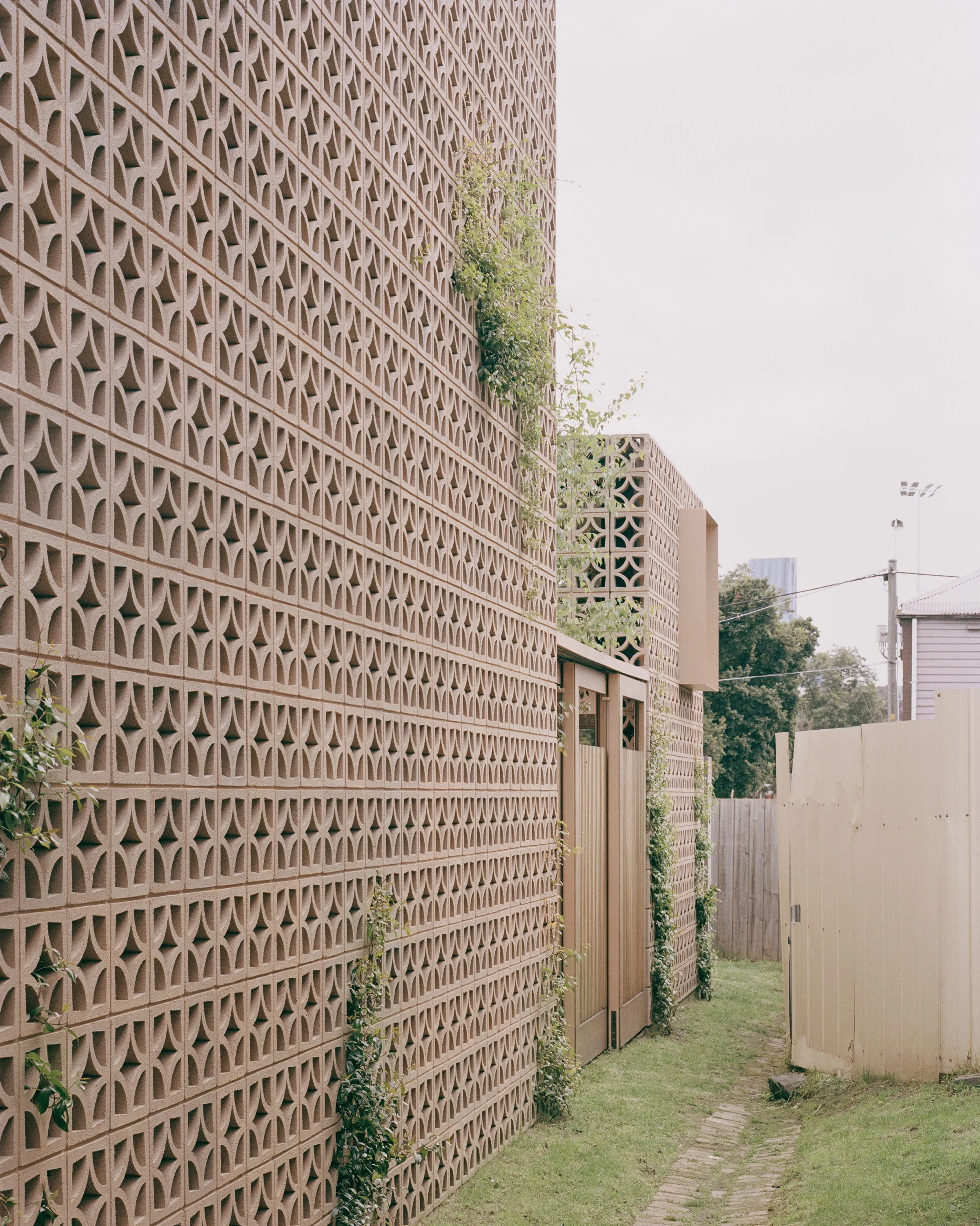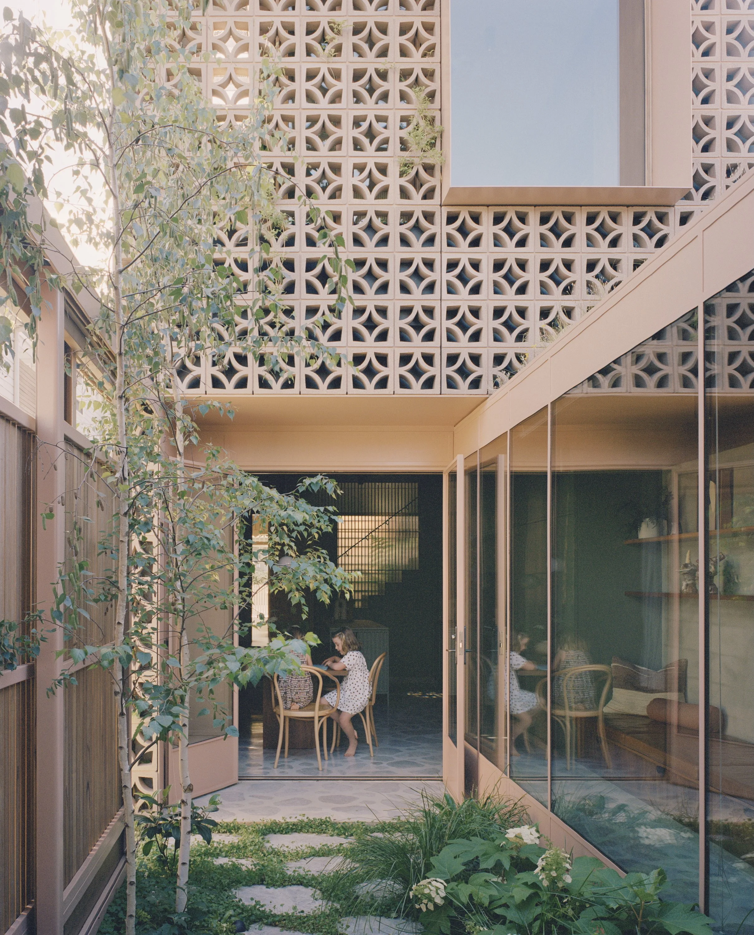 Designed by Studio Bright, Garden Tower House embraces a distinctive new feature to a worker's cottage—where muted pink breeze blocks wrap around the new addition.