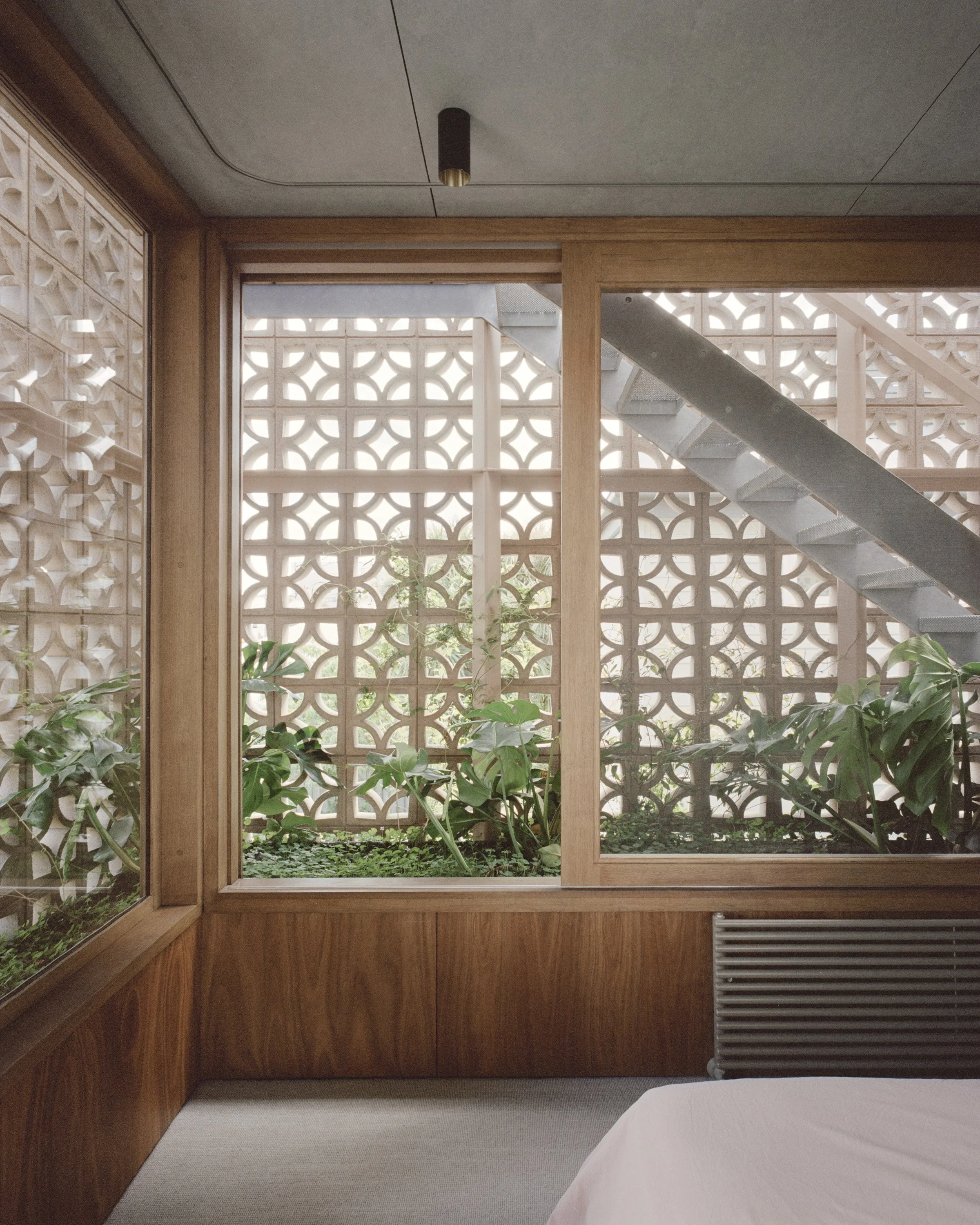 Throughout the spaces, carefully placed pockets of greenery combine to create the illusion of a verdant backyard. The planting strategy extends upward, with climbing plants designed to grow across the building's various surfaces and spaces, which will in time connect green areas across different levels of the home.