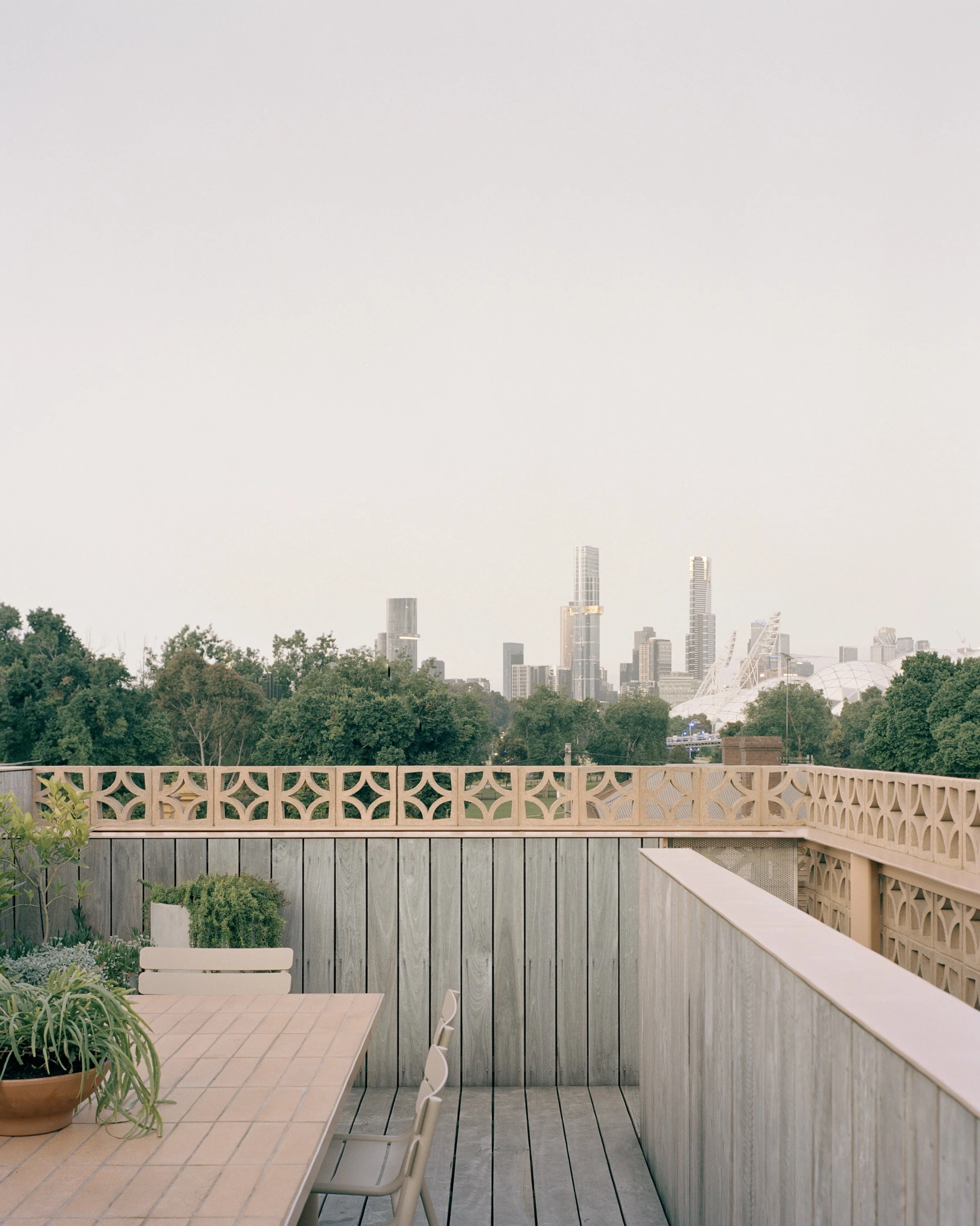 Garden Tower House features an integrated rooftop terrace space with view out across the city skyline.