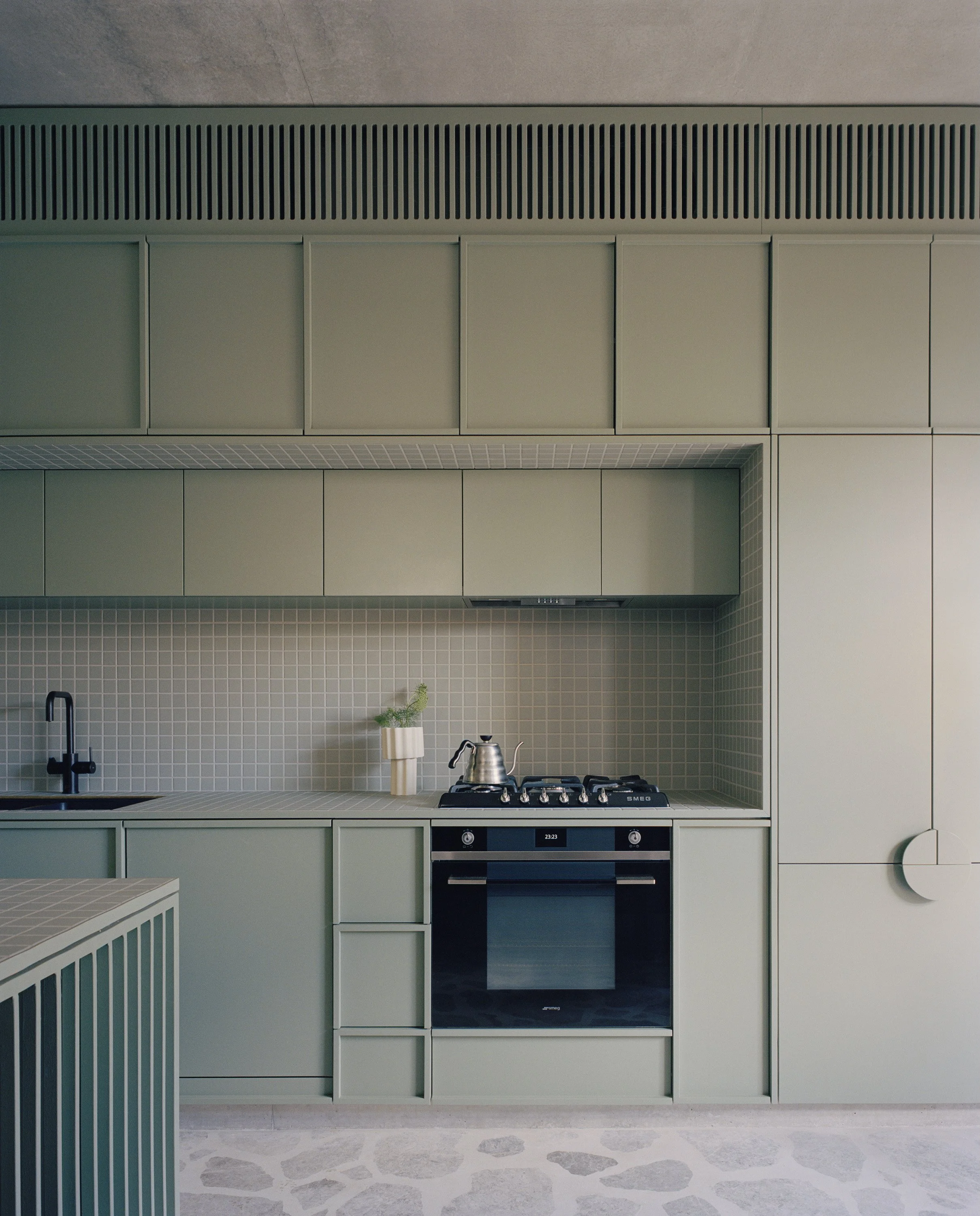 The tonal green kitchen extends to the stairs, keeping the spaces cohesive.