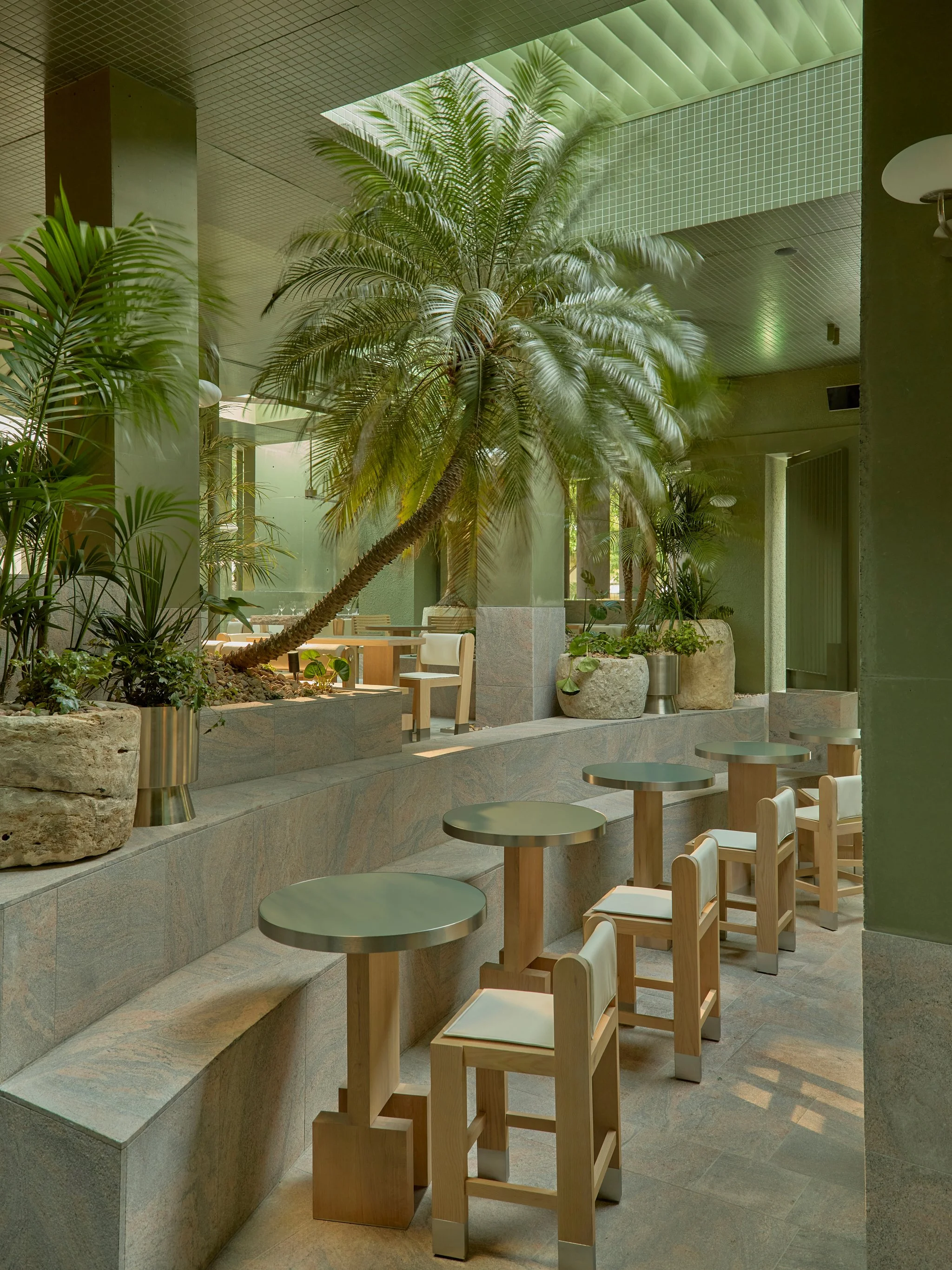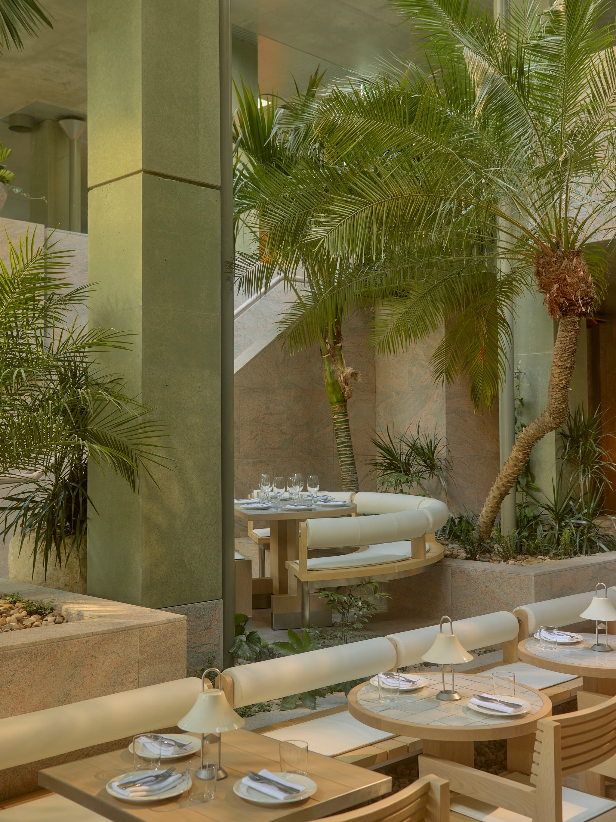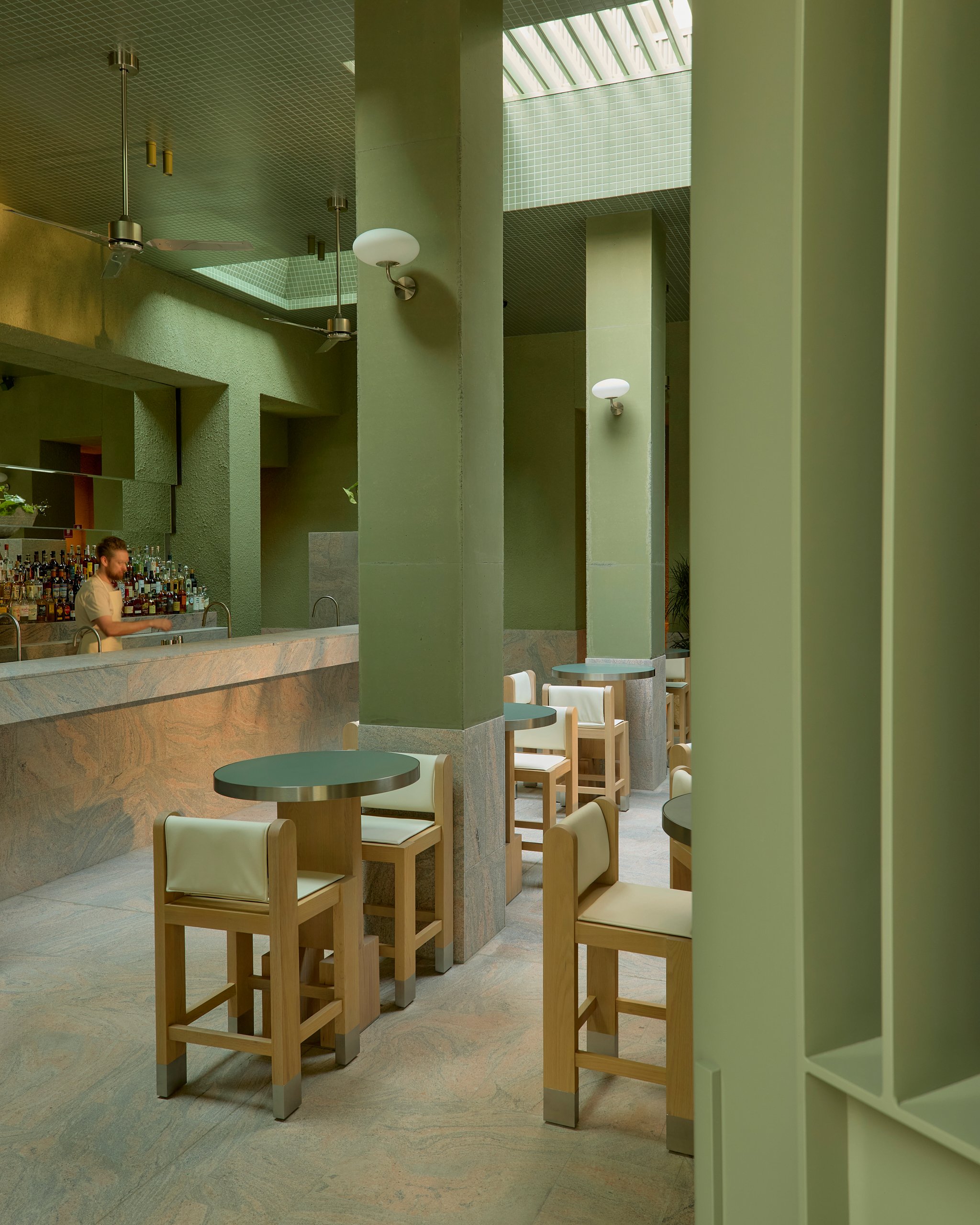 Designed by Jared Webb of J.AR OFFICE, the venue sits within a low-rise, historically preserved pocket of the city, its brutalist-inspired structure softened by skylights, tiled surfaces, textured render and garden terraces.