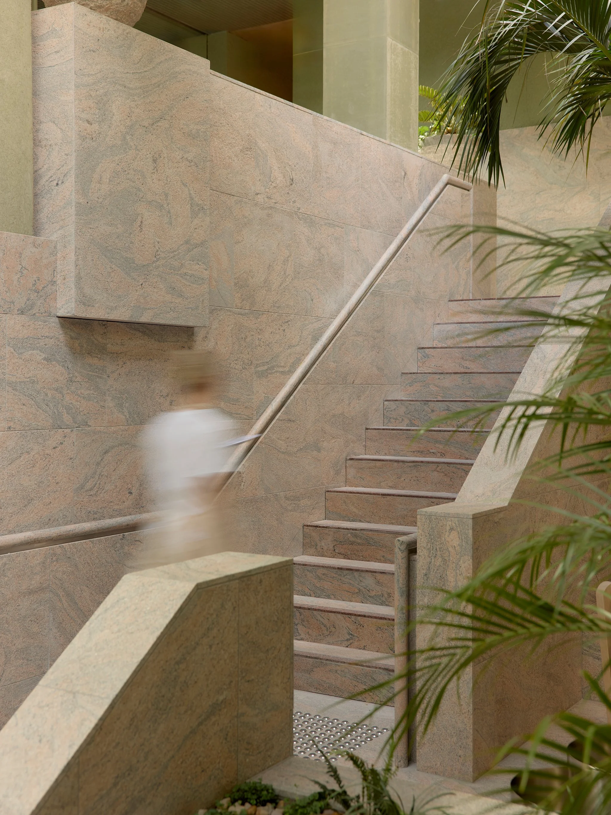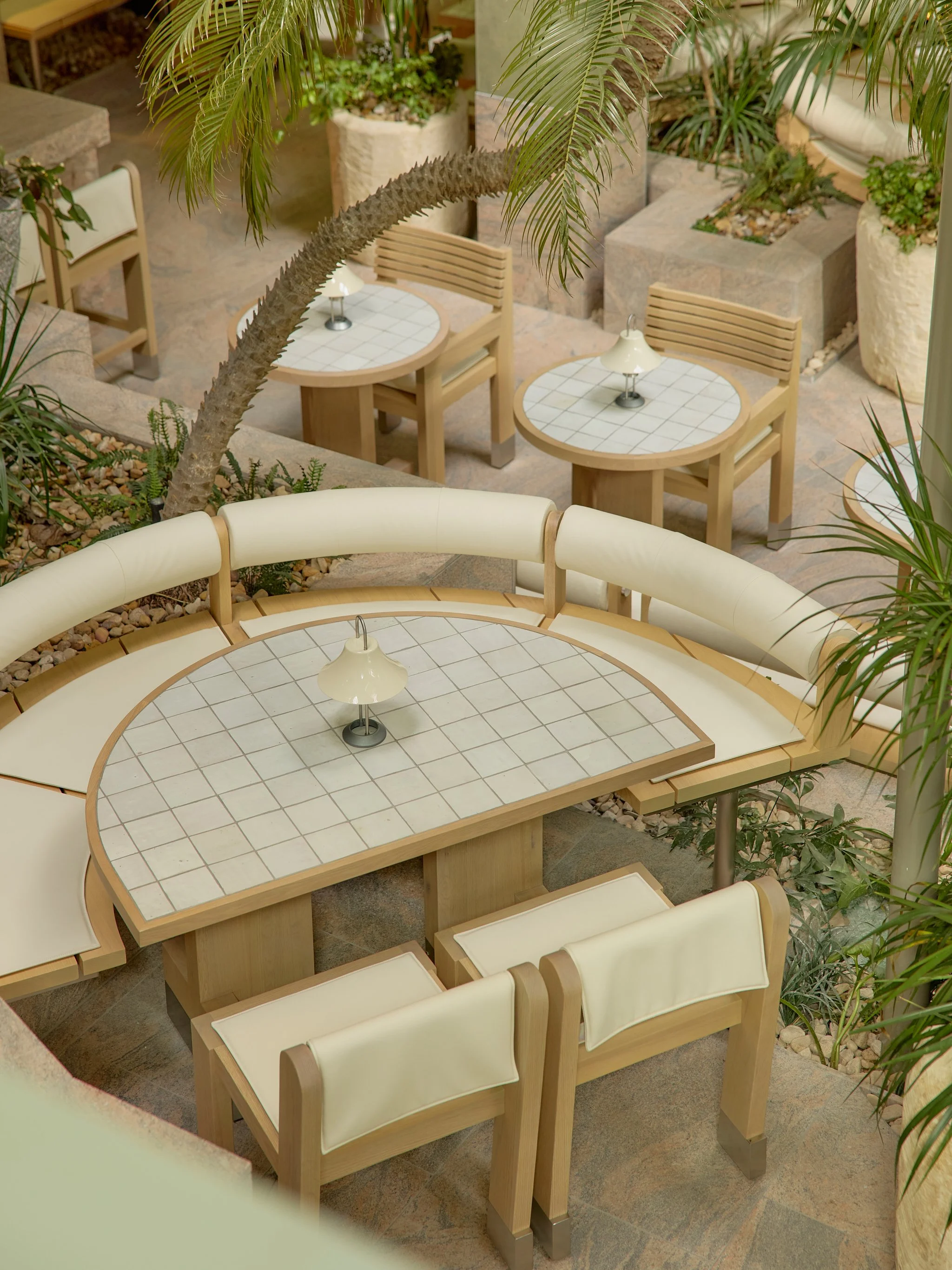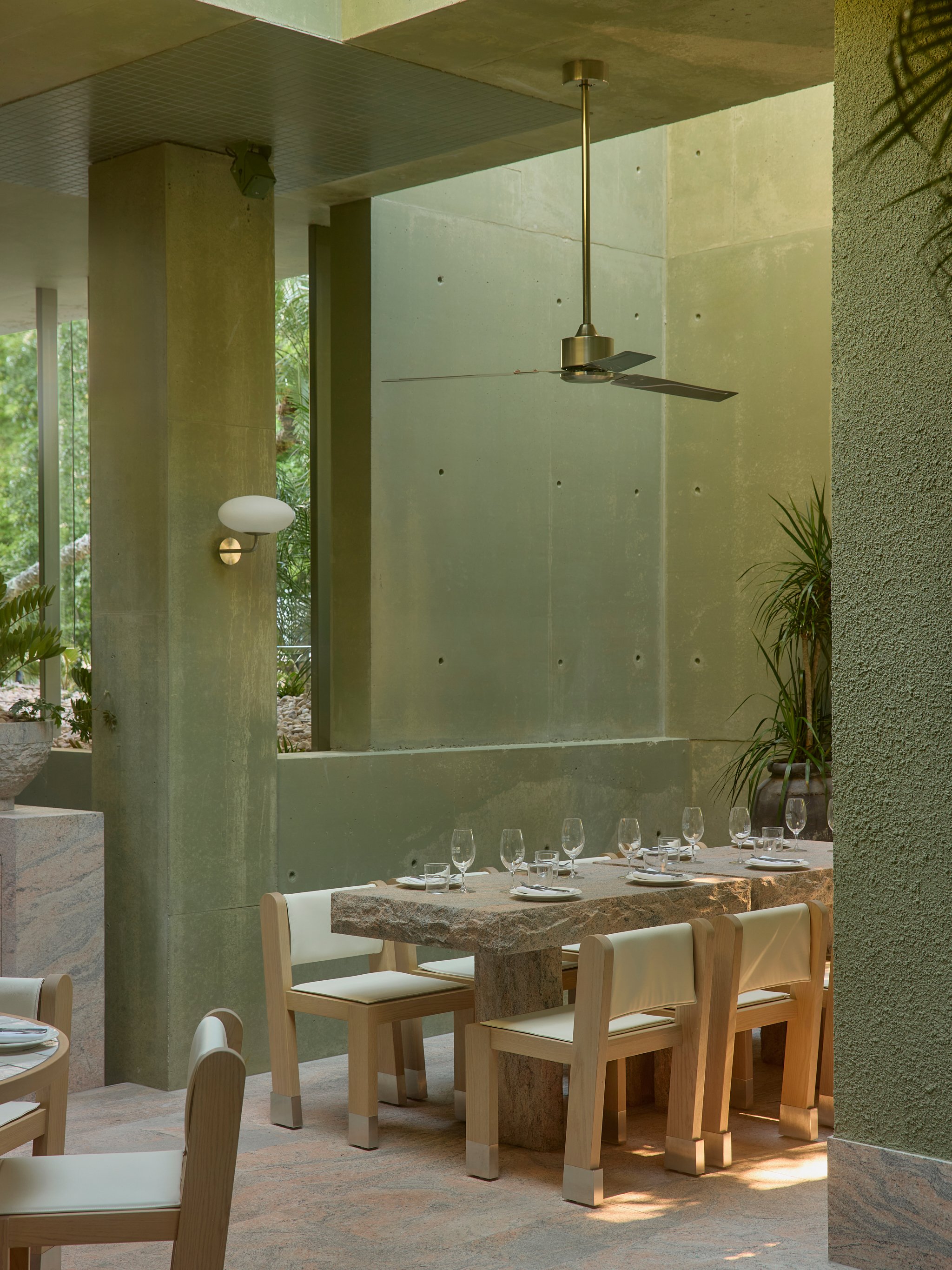 Designed by Jared Webb of J.AR OFFICE, the venue sits within a low-rise, historically preserved pocket of the city, its brutalist-inspired structure softened by skylights, tiled surfaces, textured render and garden terraces.