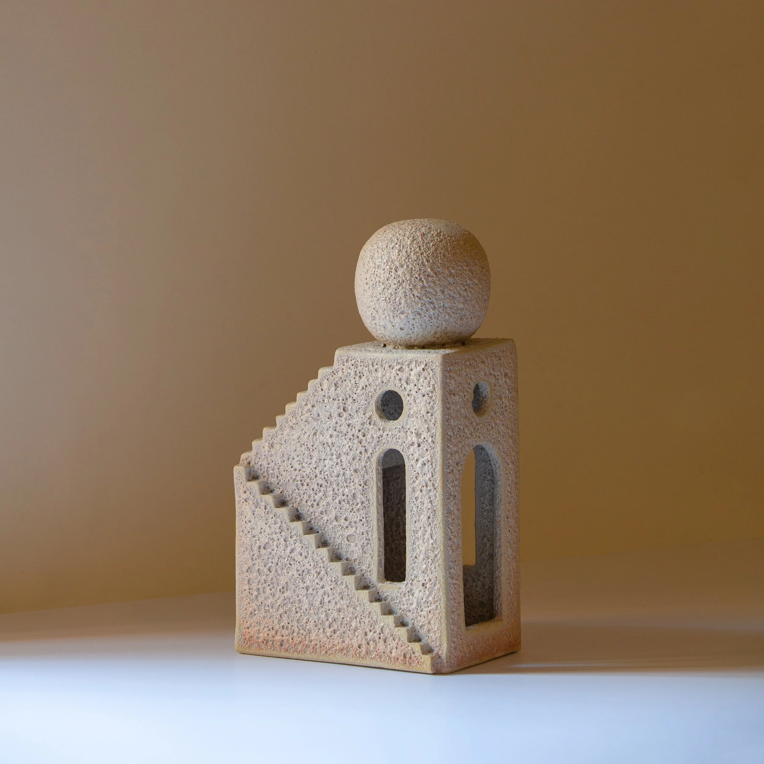 Using a combination of wheel-thrown and hand-building techniques, she builds sculptures that give glimpses into utopian cityscapes, with labyrinth forms of stairwells, sharp lines, smooth domes and archways.