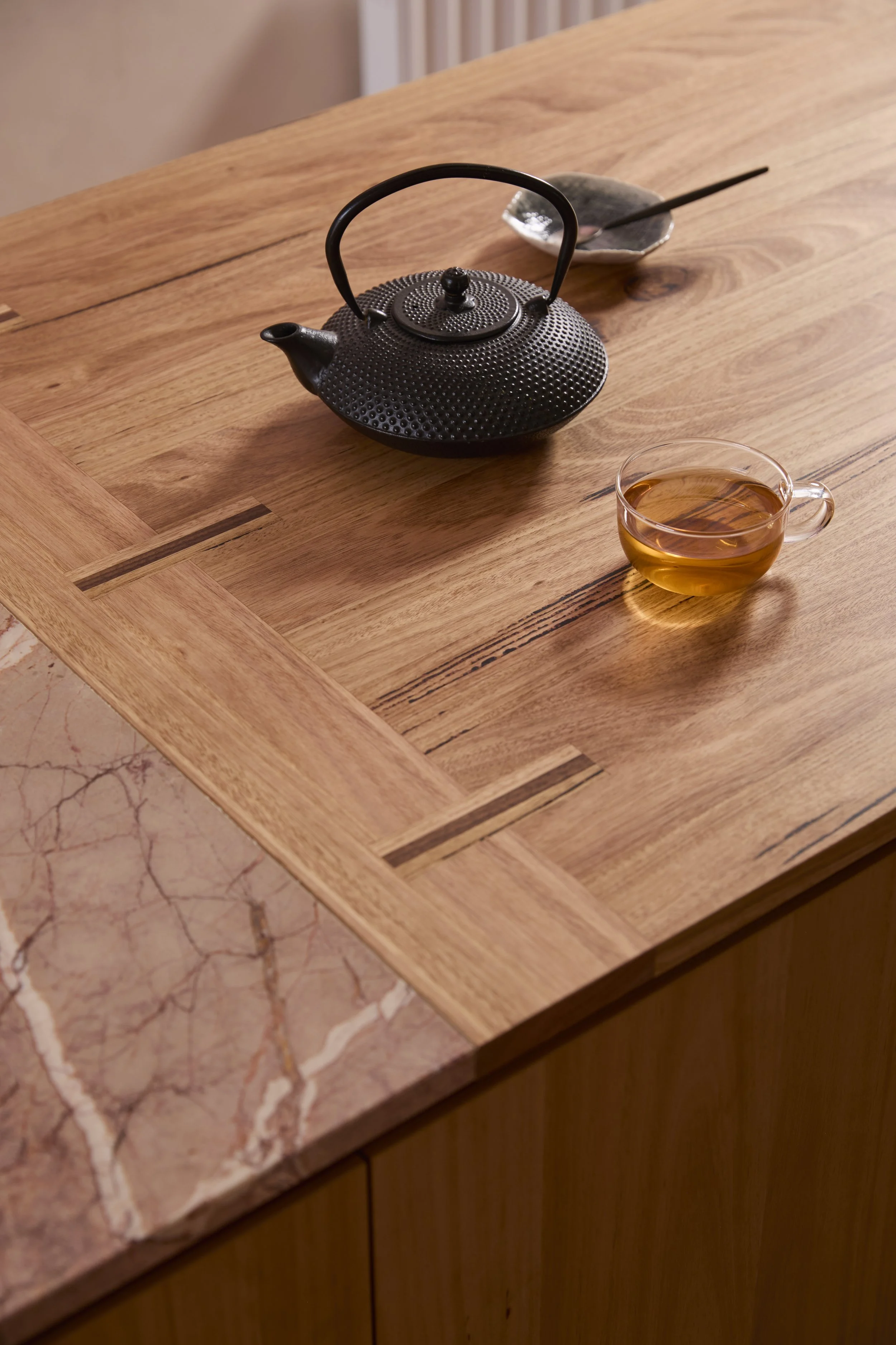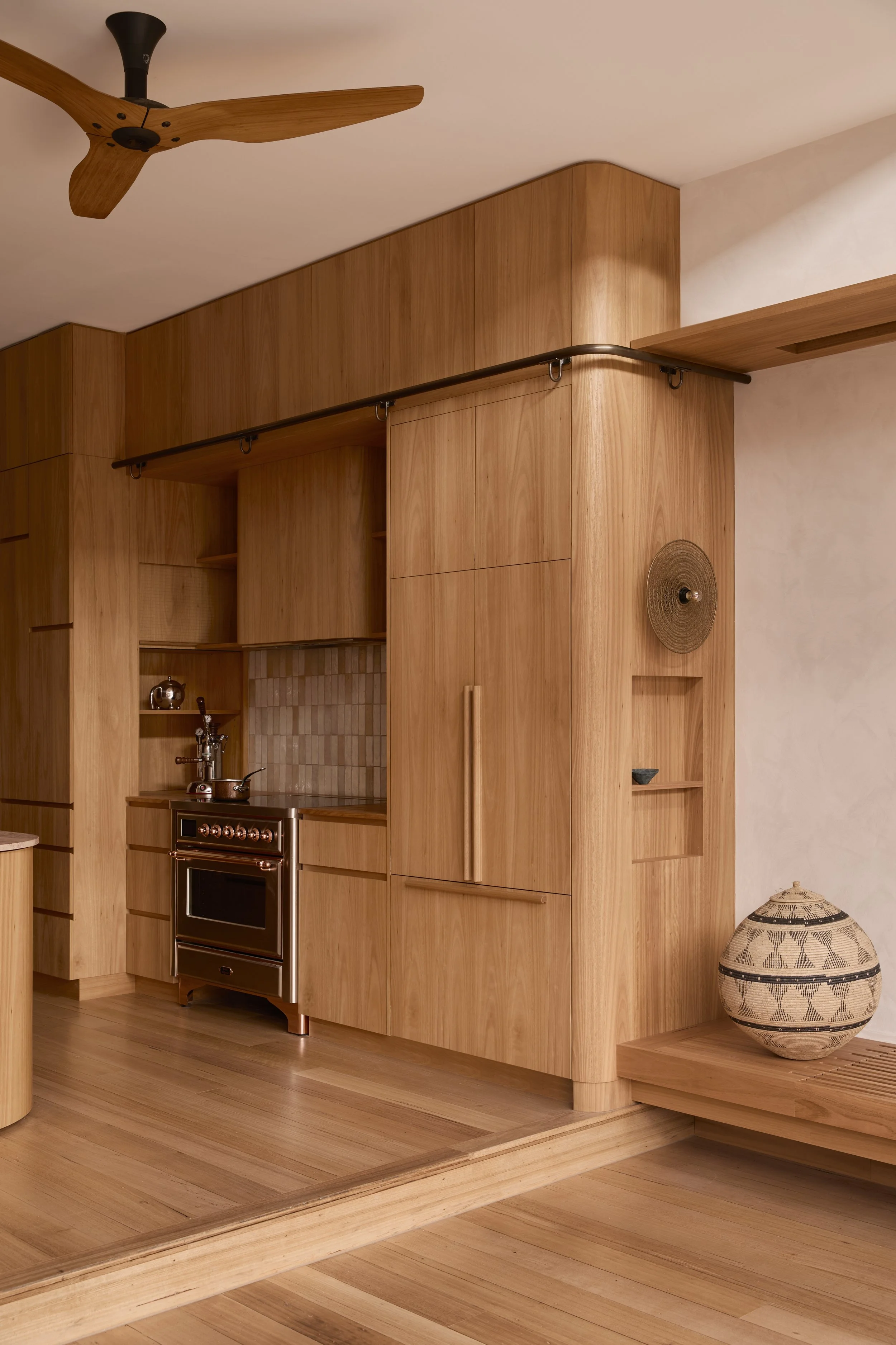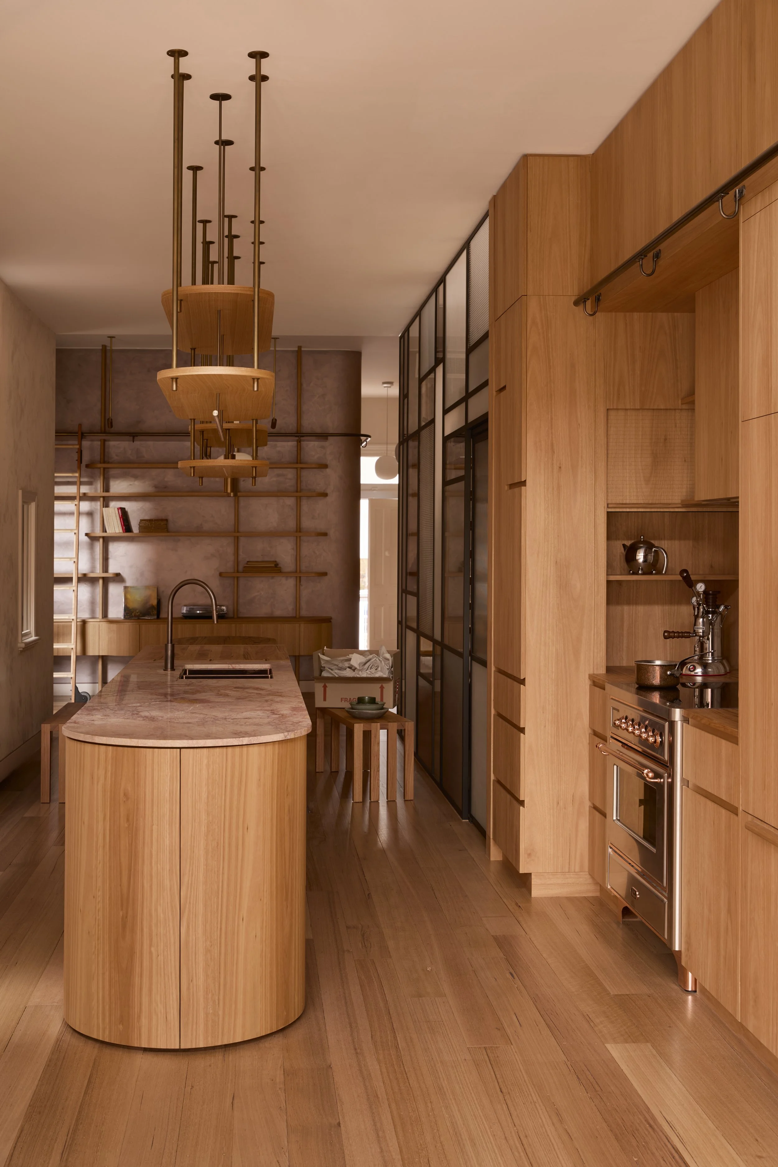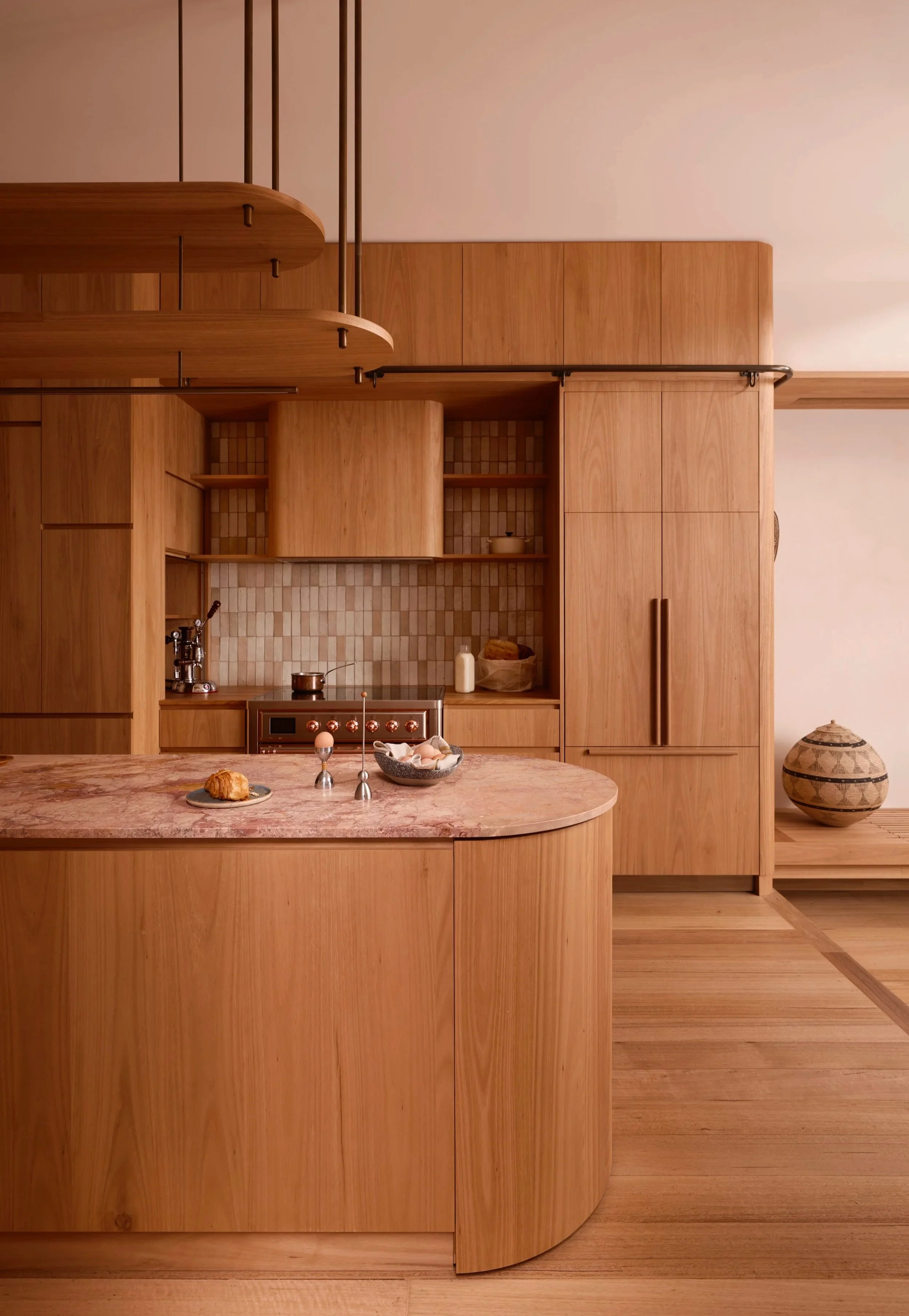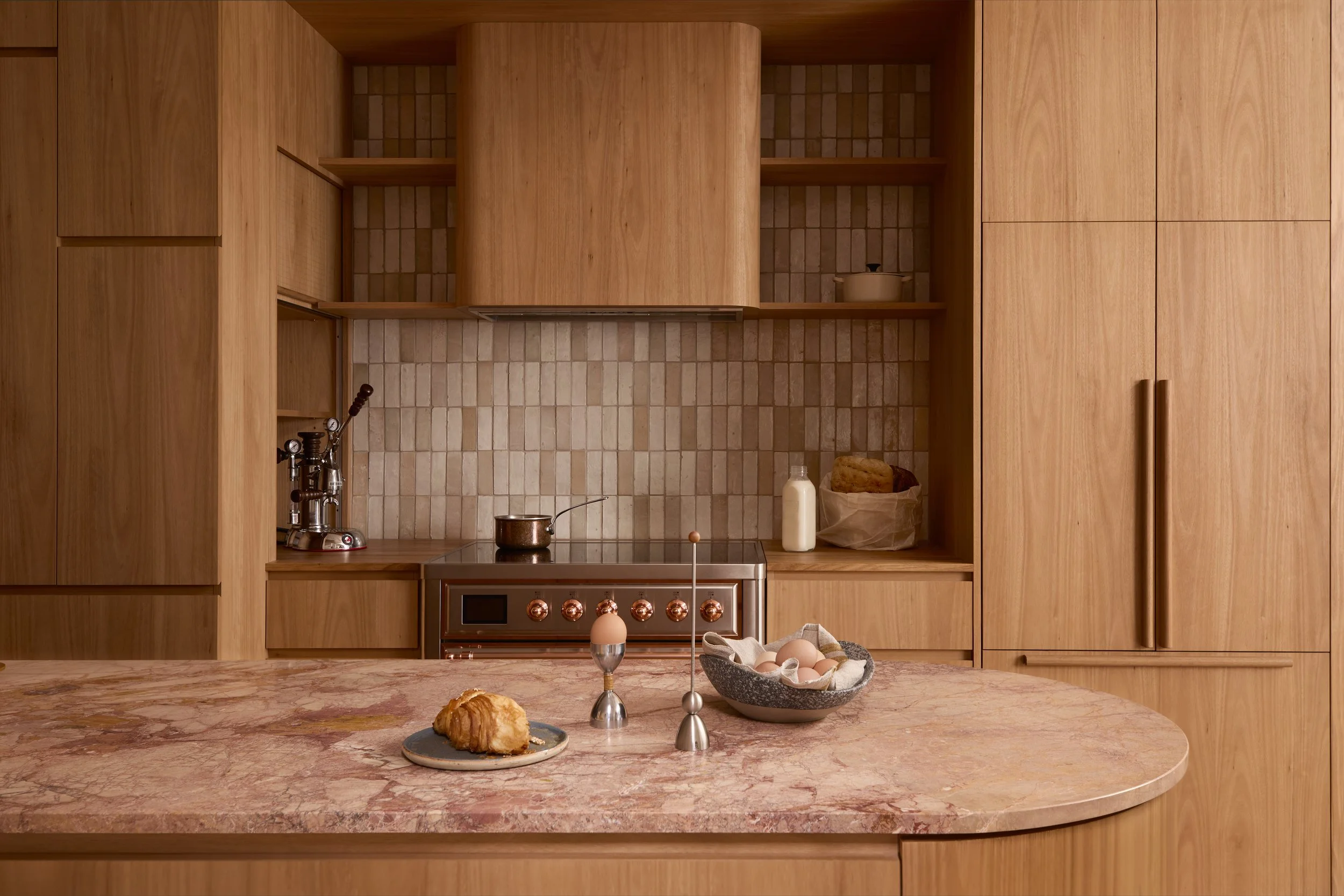 At the heart of the home, the kitchen is both hearth and bar: warm timber joinery, blush-toned stone and handmade tiles meet bespoke copper detailing.