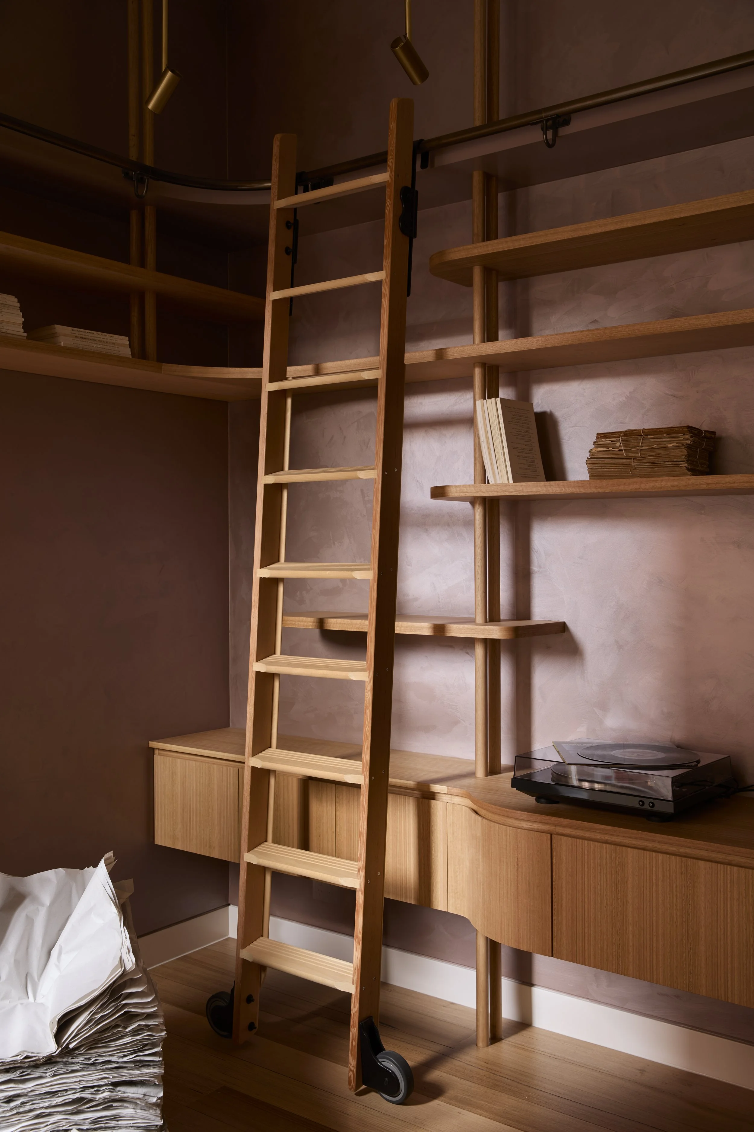 Joinery rises lightly up the wall, the ladder a reminder that utility can also be beautiful.