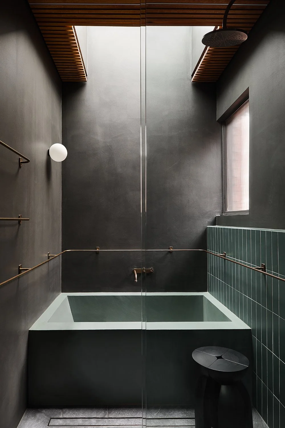 Upstairs, this Japanese sensibility continues: an onsen-like bathroom, a sculpted microcement bath rising from the floor, shoji-inspired partitions concealing study and retreat. Rhythm and restraint create a sense of calm ritual; a slower architectural register.
