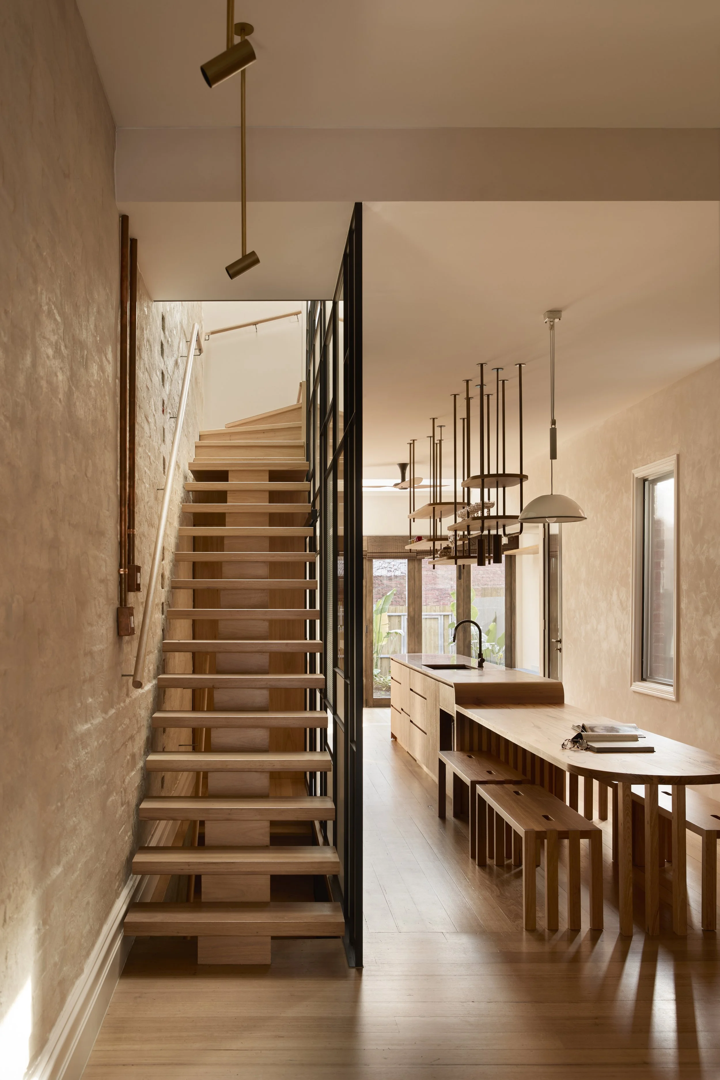 Wedged between party-walls, the central challenge was daylight. Working in close collaboration with Steffen Welsch Architects, the plan was completely rethought, extending both levels, relocating the staircase and introducing skylights and a clerestory window that carve a luminous vertical spine through the home. Floating treads, a slender central stringer and a shoji-inspired balustrade bring a quiet precision to the centre, drawing daylight deep into the interior.