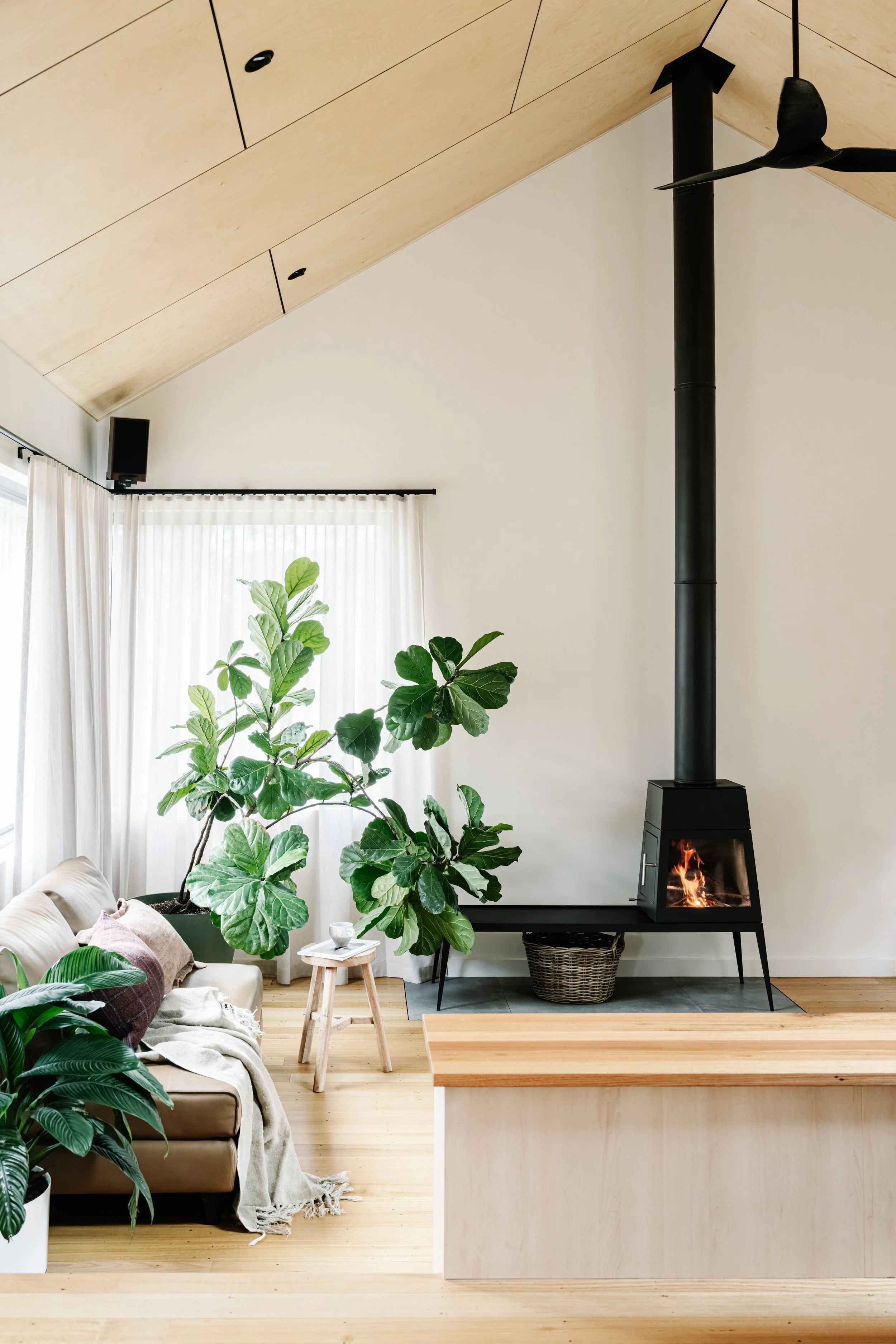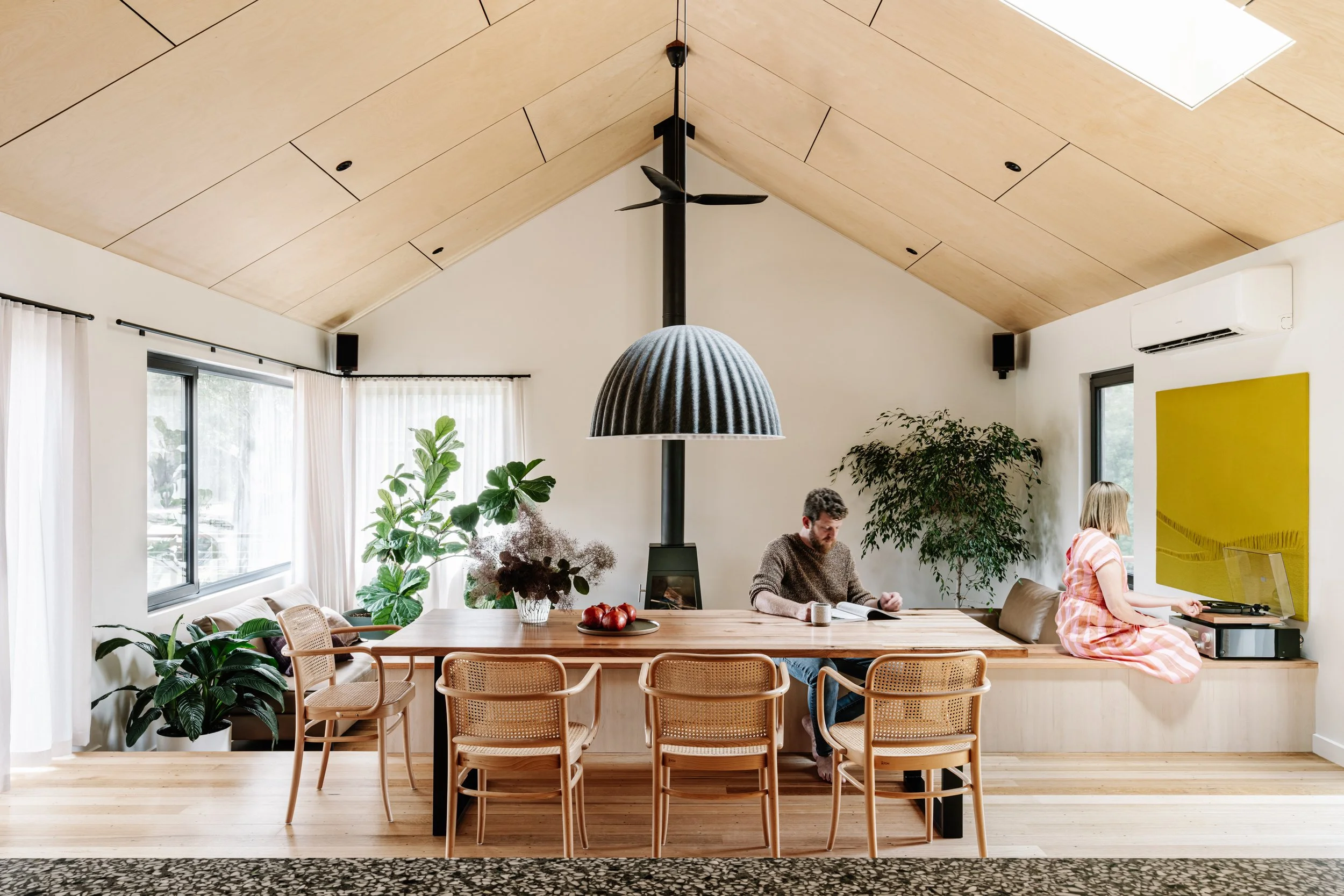 Materially, the house is robust and low-maintenance, Colorbond cladding and roof are softened by moments of cedar shingles; inside, recycled hardwood floors ground the rooms beneath ply ceilings. Performance is handled quietly—a well-insulated, airtight envelope with double-glazed tilt-and-turn windows, an all-electric spec (induction cooking and a heat-pump hot-water system), and a freestanding wood fireplace for winter.