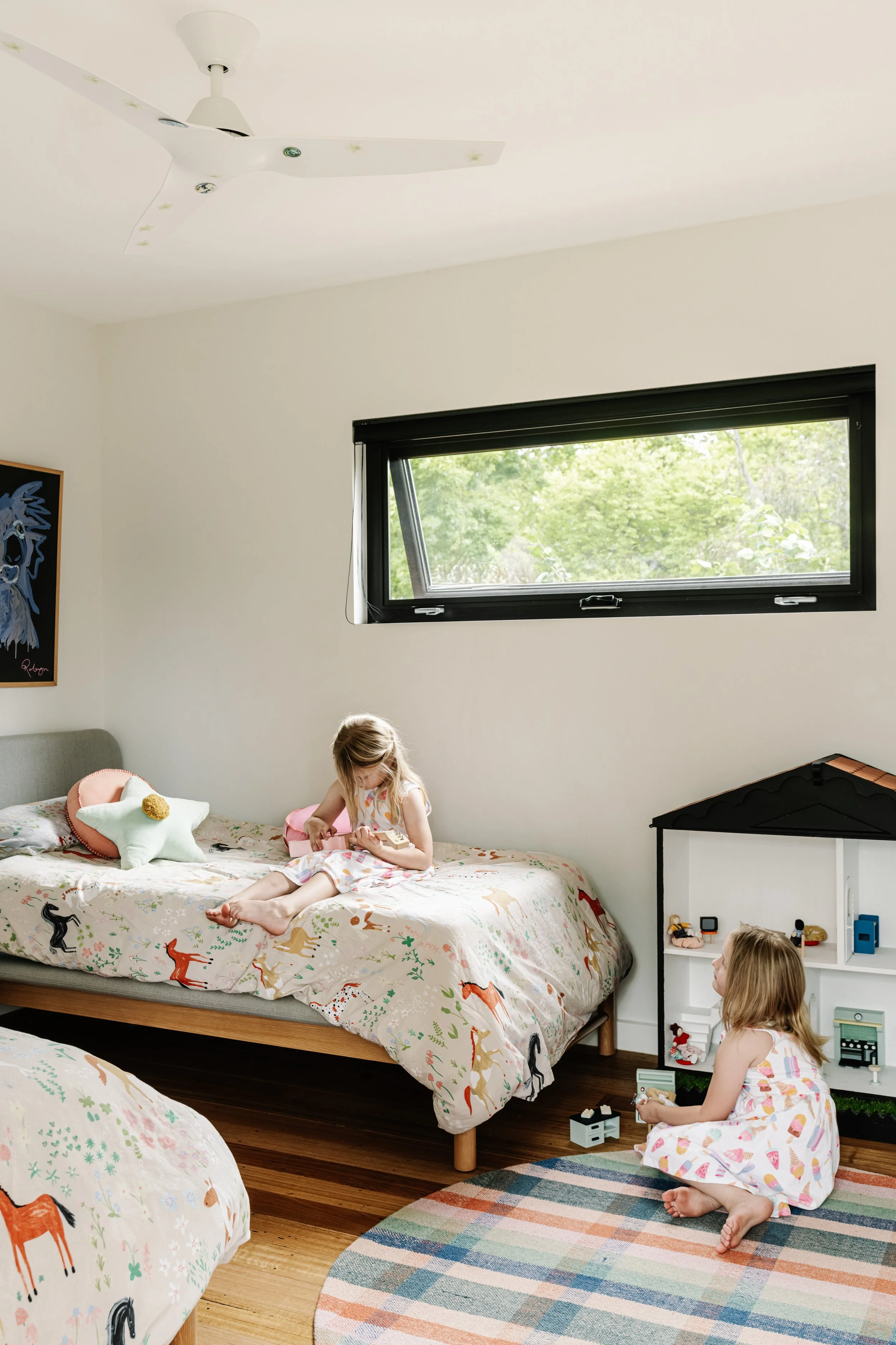 Everything starts with the site—privacy, sun, outlook. Silas sets the strategy: shield the street, face north for winter light and long views to the creek, and tighten sight lines to neighbours so it reads rural from within. ‘Our response was to use the siting of the building to create privacy from the street and also to optimise passive solar design,’ she says. ‘We oriented the living areas to the north, which also allowed us to take advantage of longer views along the length of the block and over the creek—we were careful to limit views towards the immediate neighbours to enhance the feeling of living in a rural setting.’ Beyond the boundary, the homeowners are regenerating the adjacent lot, which will improve the creek line and the outlook over years to come.