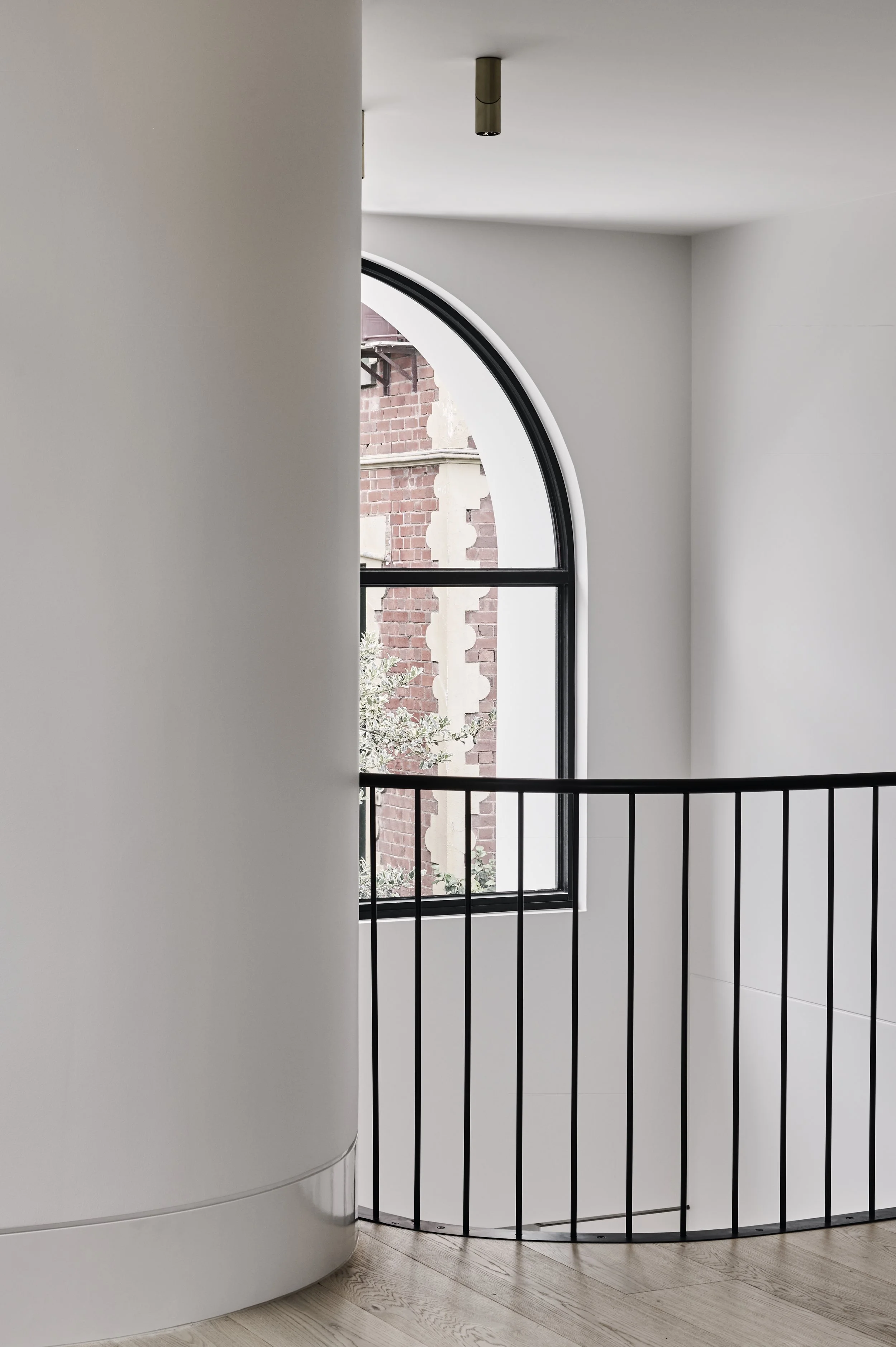 Curved forms and graphic lines frame glimpses of the home’s original brickwork—a conversation between old and new.