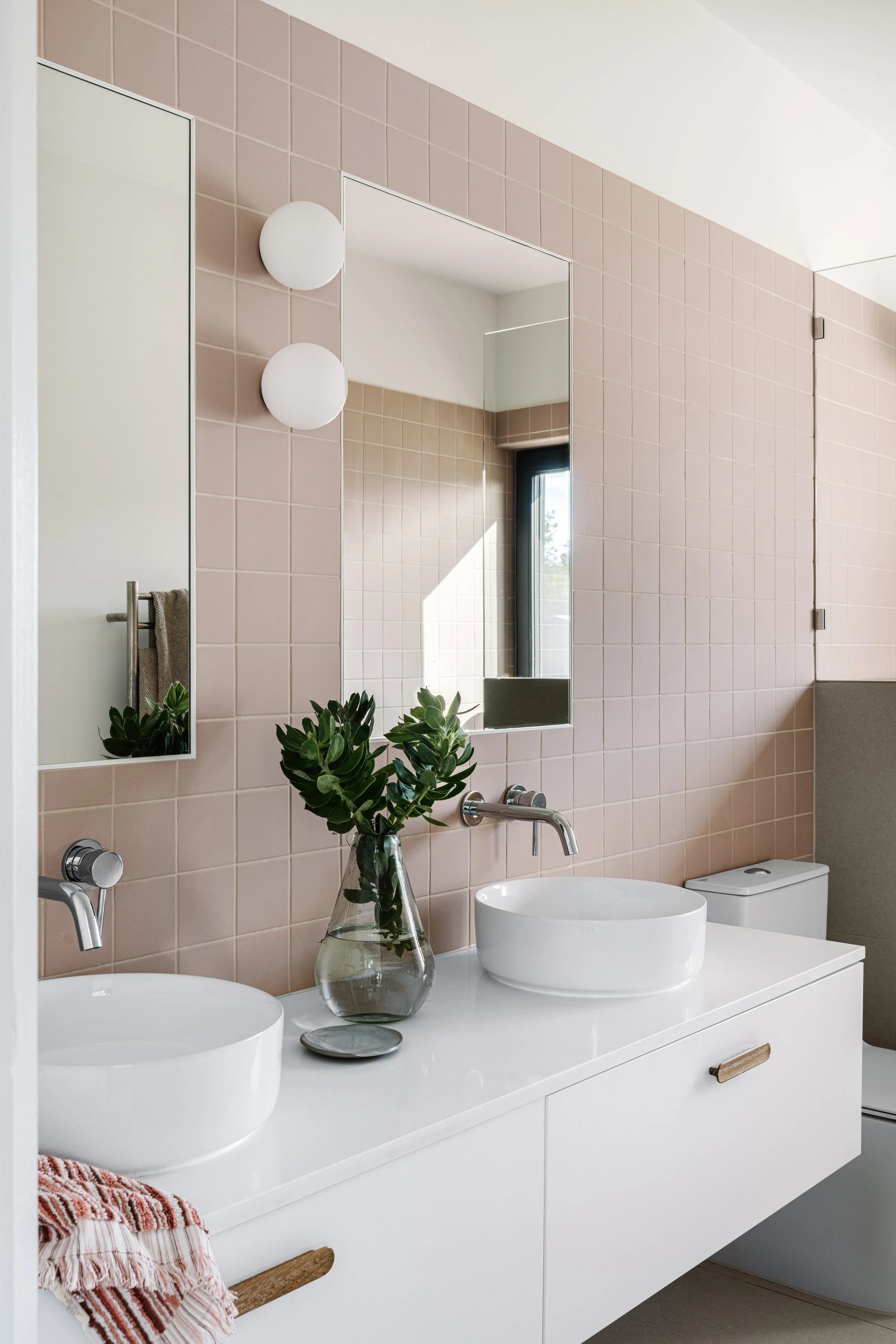 Gentle geometry: blush tile, pale stone and a frameless screen, with fresh air managed by the home’s balanced ventilation.