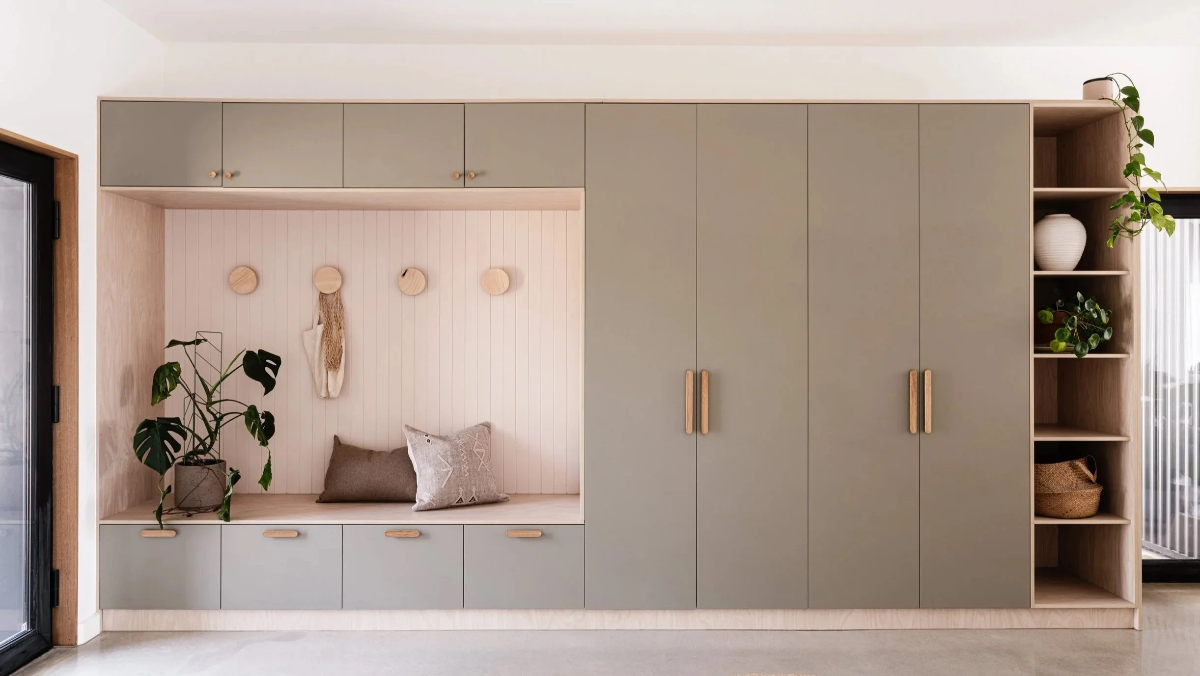 In the laundry, simplified: integrated storage, mosaic splashback and a ceiling-mounted drying rack—paired with energy-efficient appliances in an airtight, even-temperature envelope.