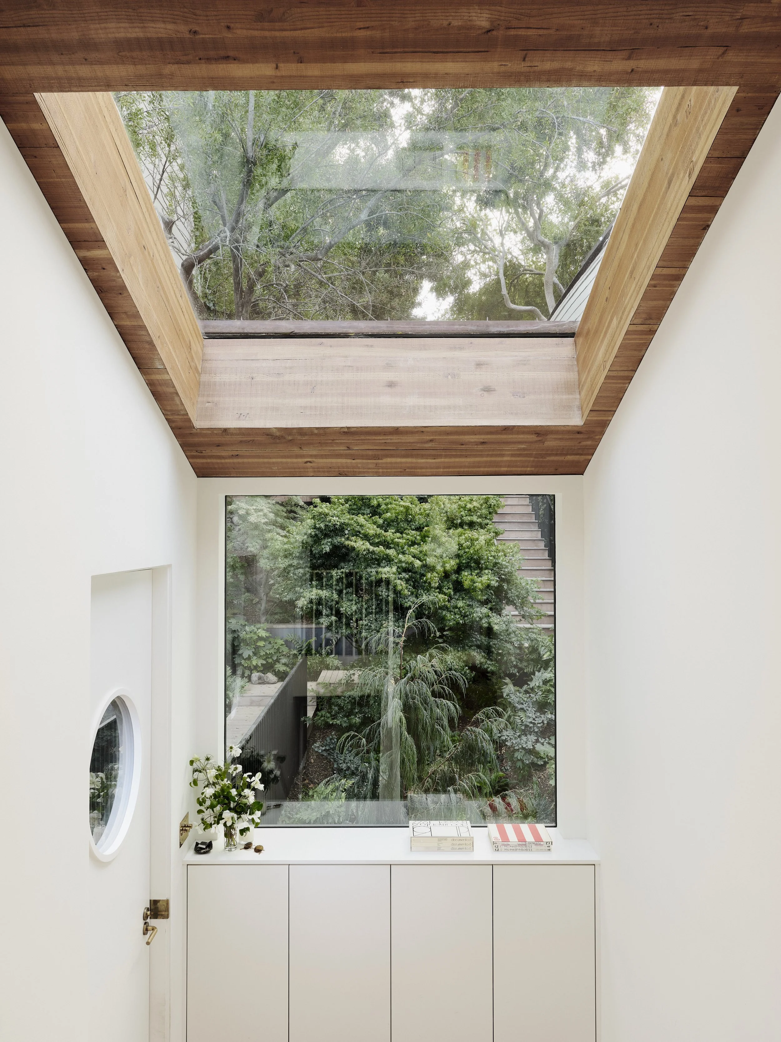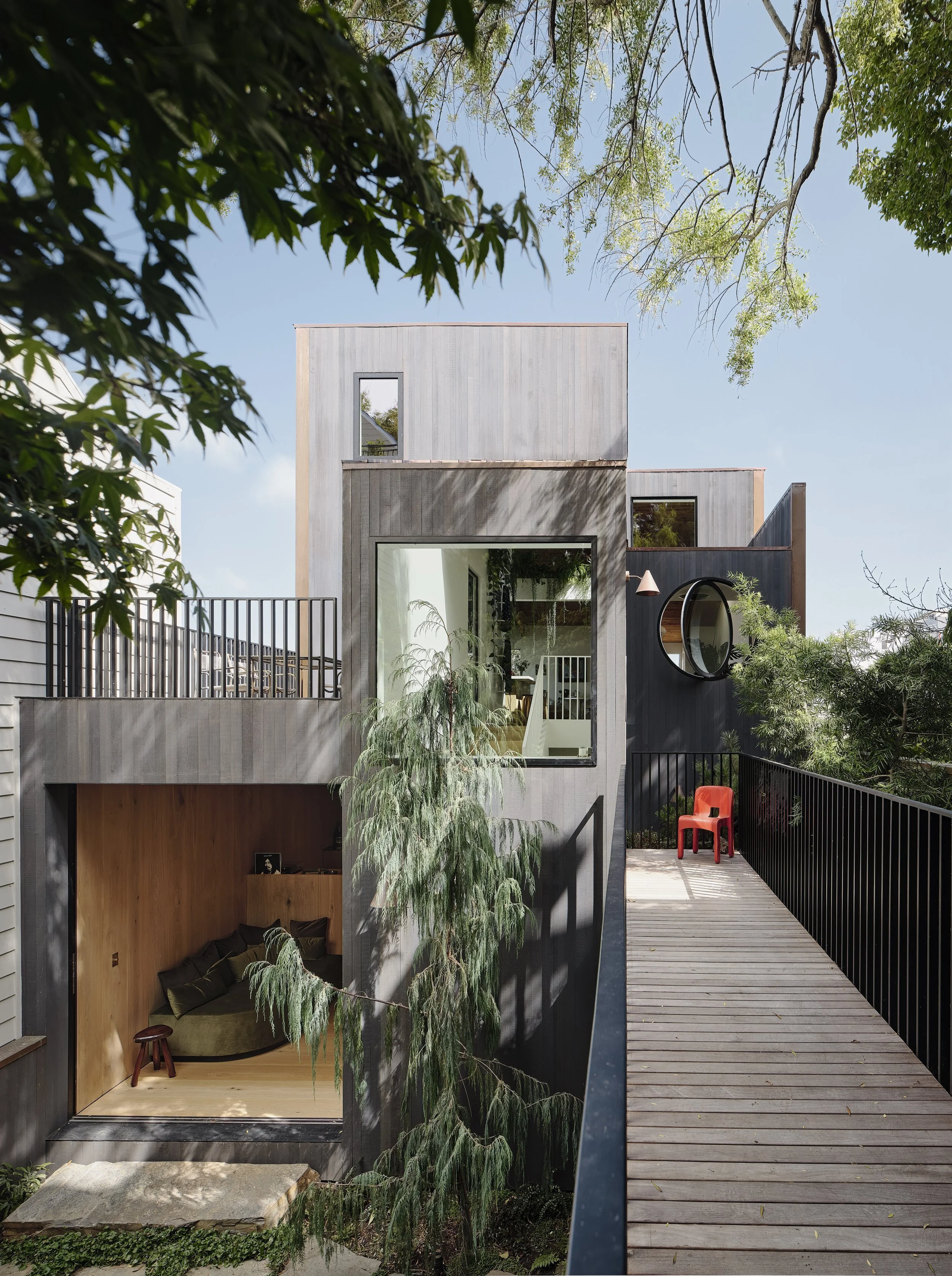 ‘To resolve [the issue of circulation] we created a new entry sequence, including a bridge, which spans from the front garden, over the landscaped lower courtyard, to a new front door and entry hall,’ says Ryan Leidner. Photo: Joe Fletcher