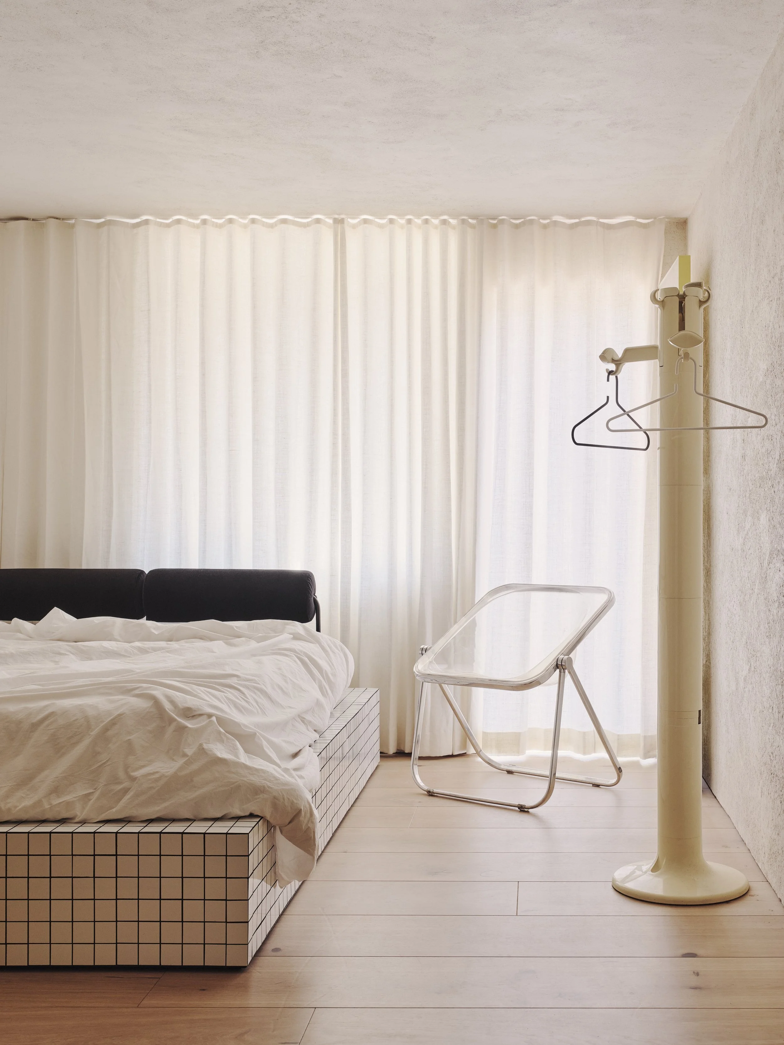 A custom tiled bed frame and vintage Castelli pieces in the guest bedroom; the Plona chair in clear and Planta coathanger and umbrella holder nodding to Italian modernist design. Photo: Joe Fletcher