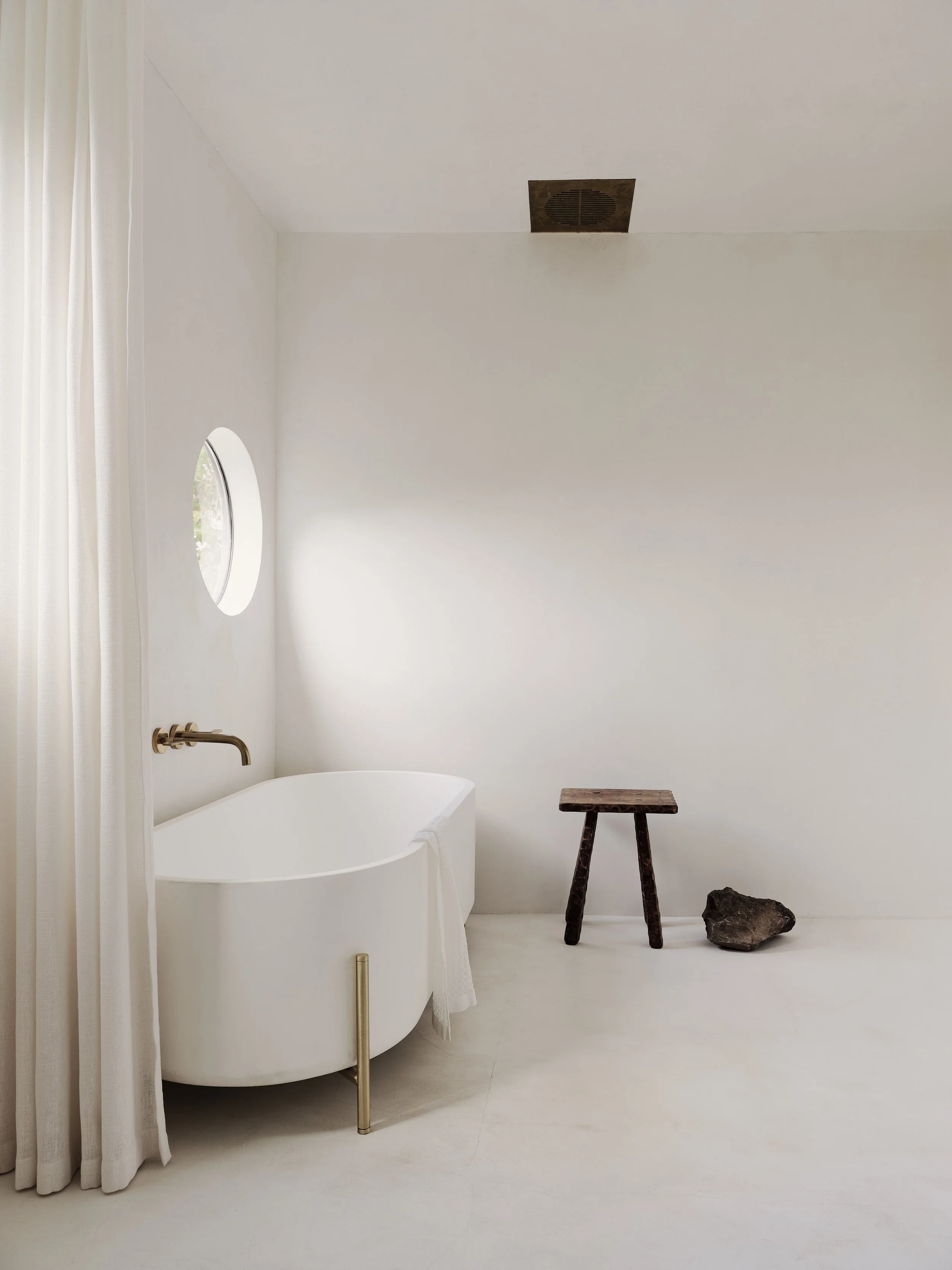 The simple and calming bathroom space featuring the Stand Bathtub by Norm Architects. Photo: Joe Fletcher