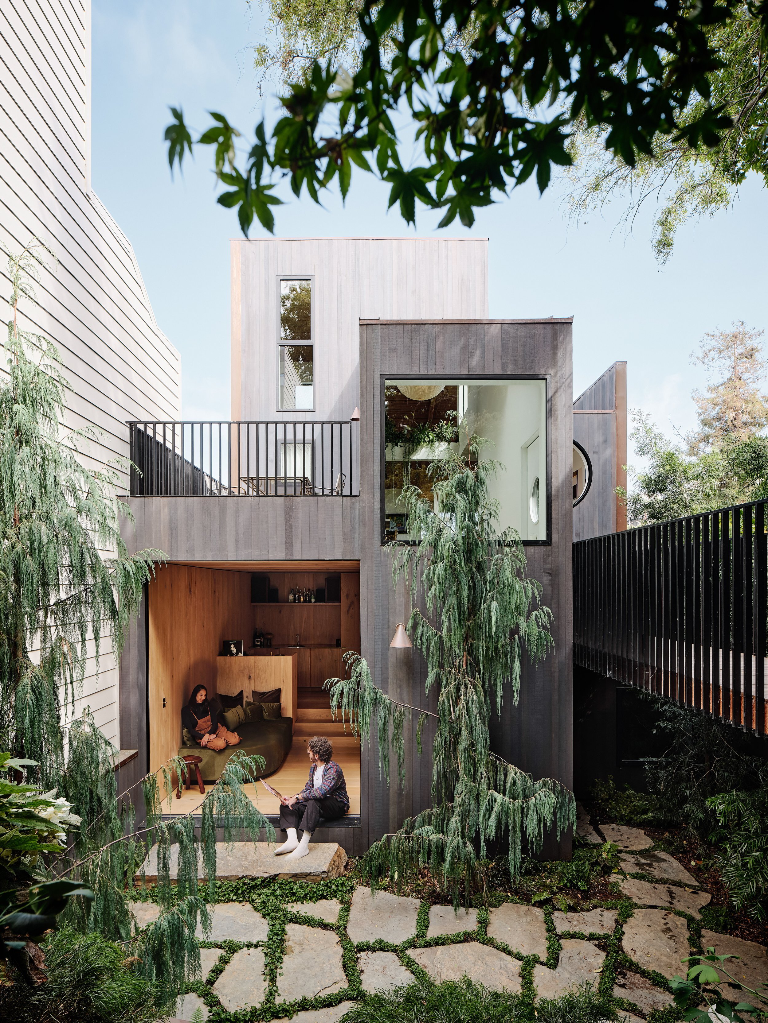 Nestled away from the street behind a lush garden and architectural footbridge, Ryan Leidner Architecture’s, Hosono House, offers the best of both worlds – tranquil retreat living and sweeping city views.