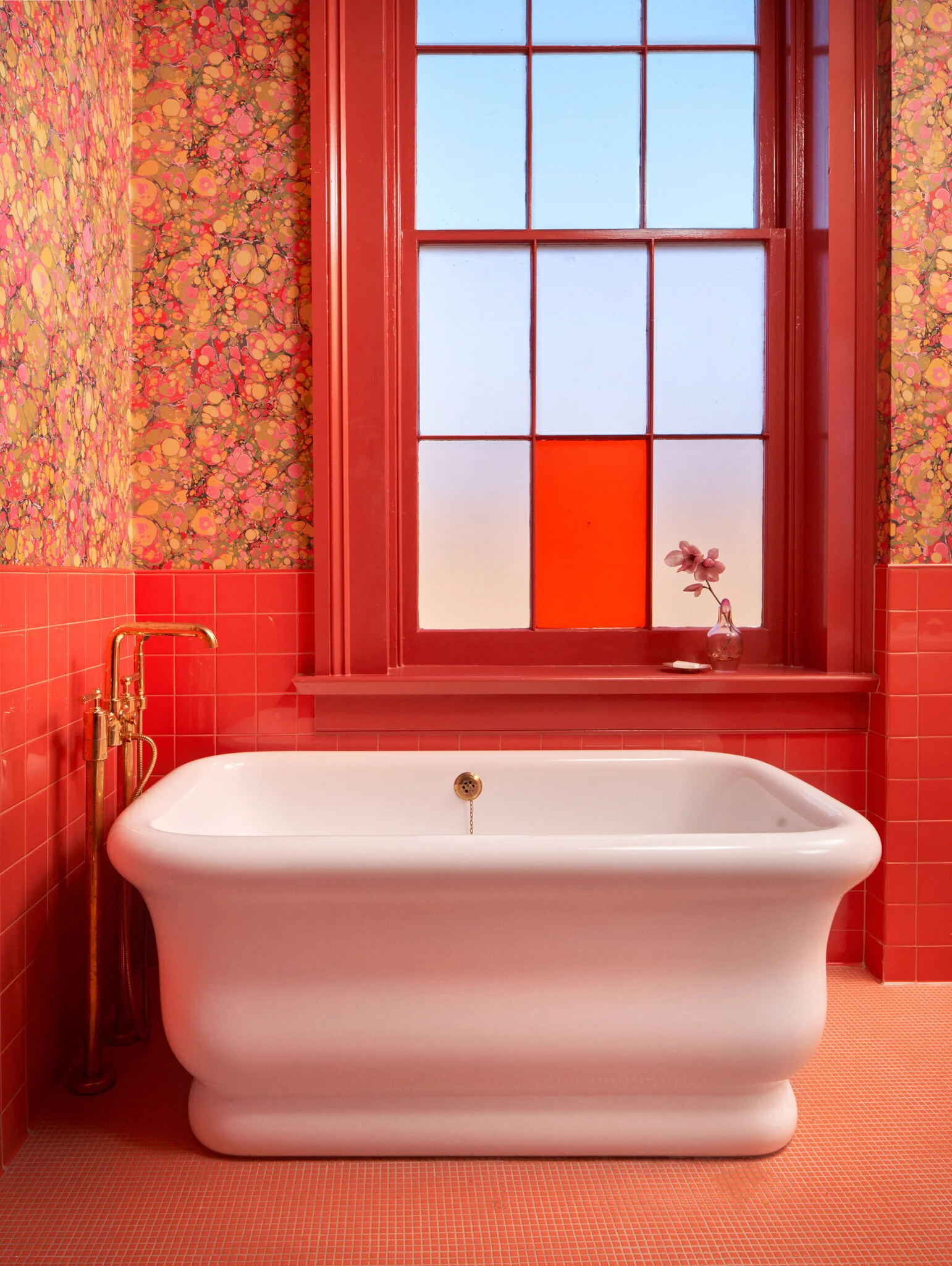 Each of the rooms in the hotel have unique layouts full of luxurious materials like deep red mohair, salmon coloured velvet curtains, red lacquer millwork, and Carrara marble alongside an eclectic mix of vintage art and objects. Red and pink tile bathrooms are lined in a custom psychedelic ‘Voutsa’ wallpaper derived from traditional Florentine marble book bindings found within The Saint Vincent’s Infant Asylum founder Margaret Haughery ledgers.