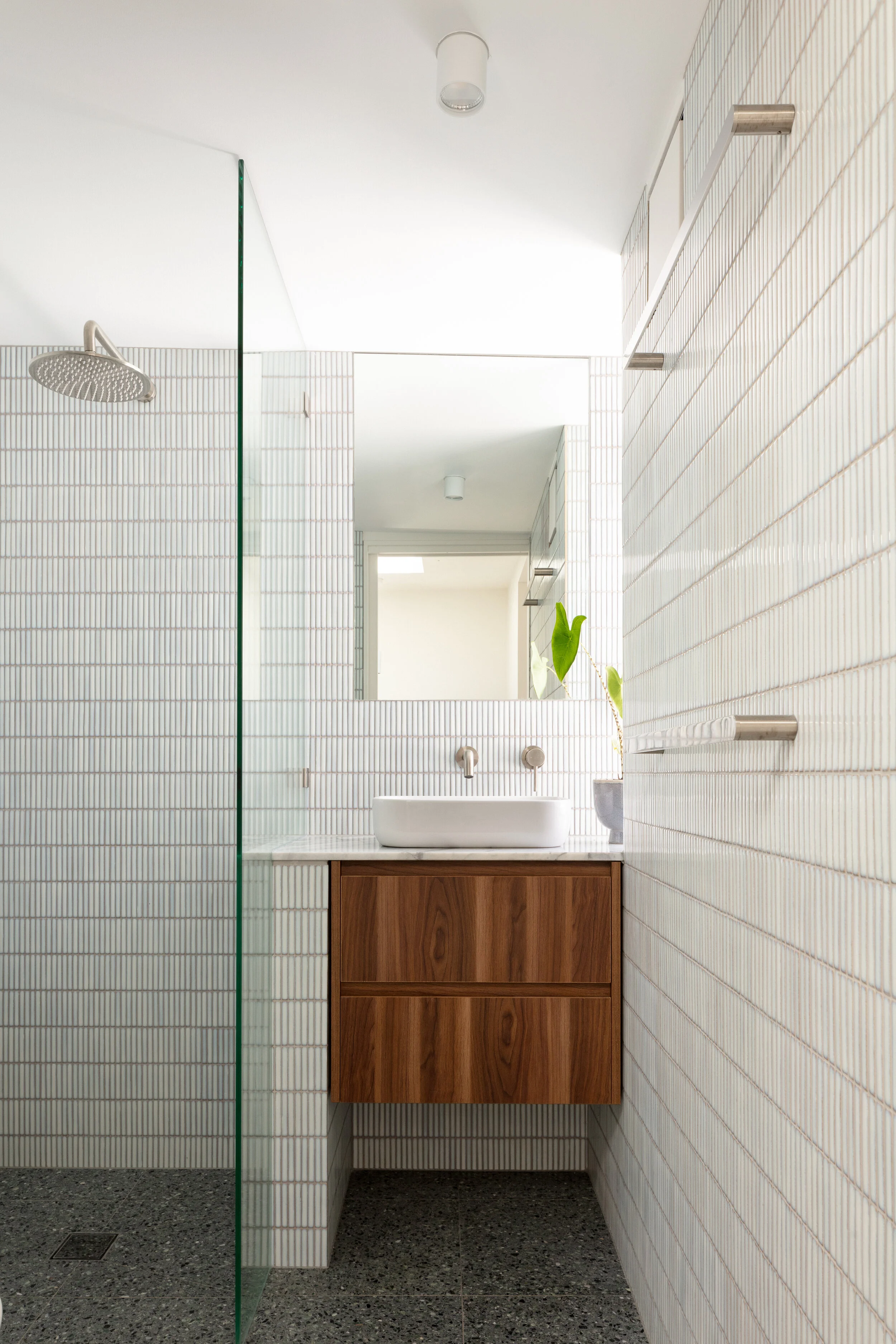 The simple and streamlined bathroom space featuring a minimal palette. Photo: Clinton Weaver