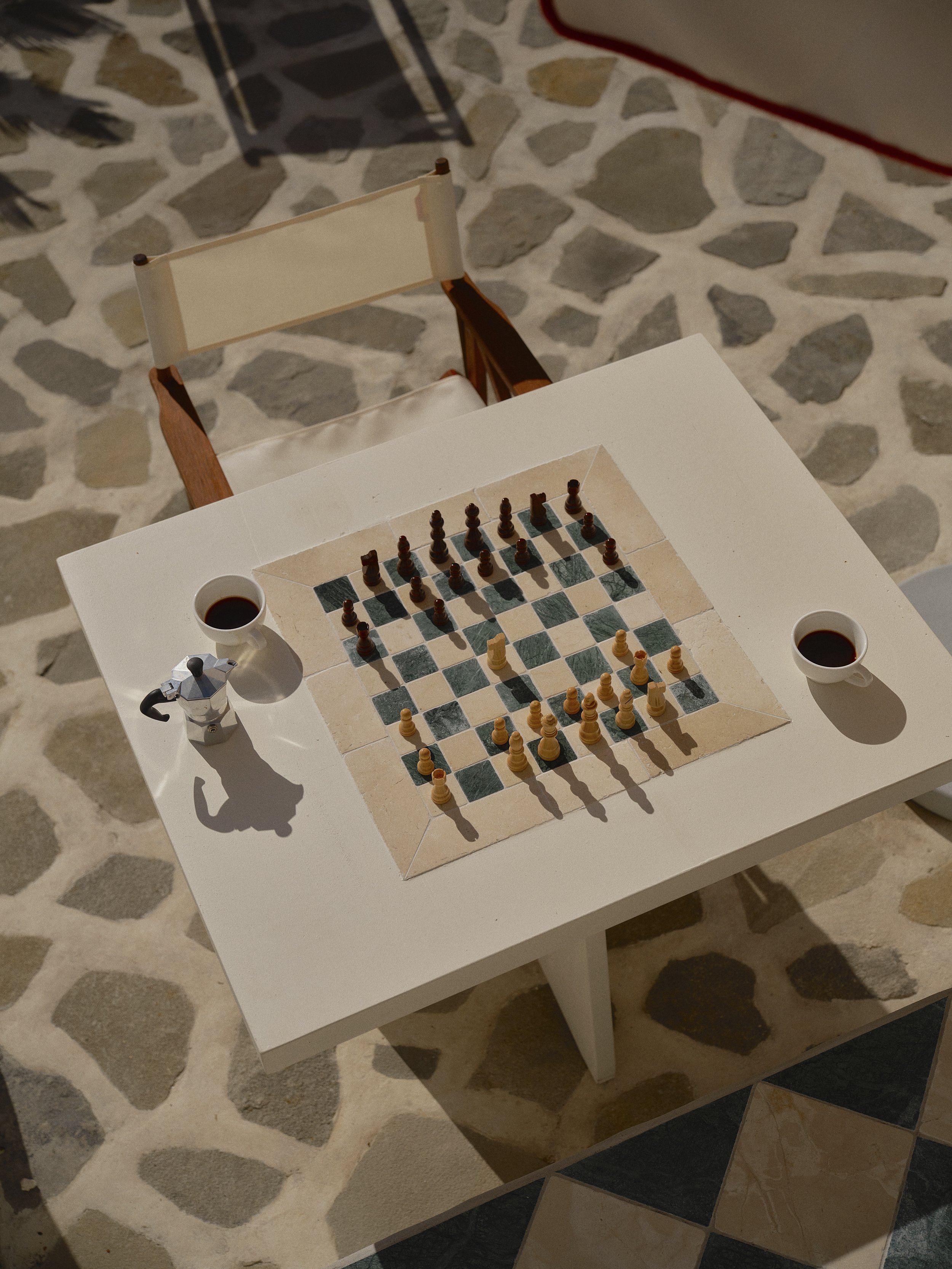 An espresso and a game of chess on custom-made tables on The Lido Terrace.