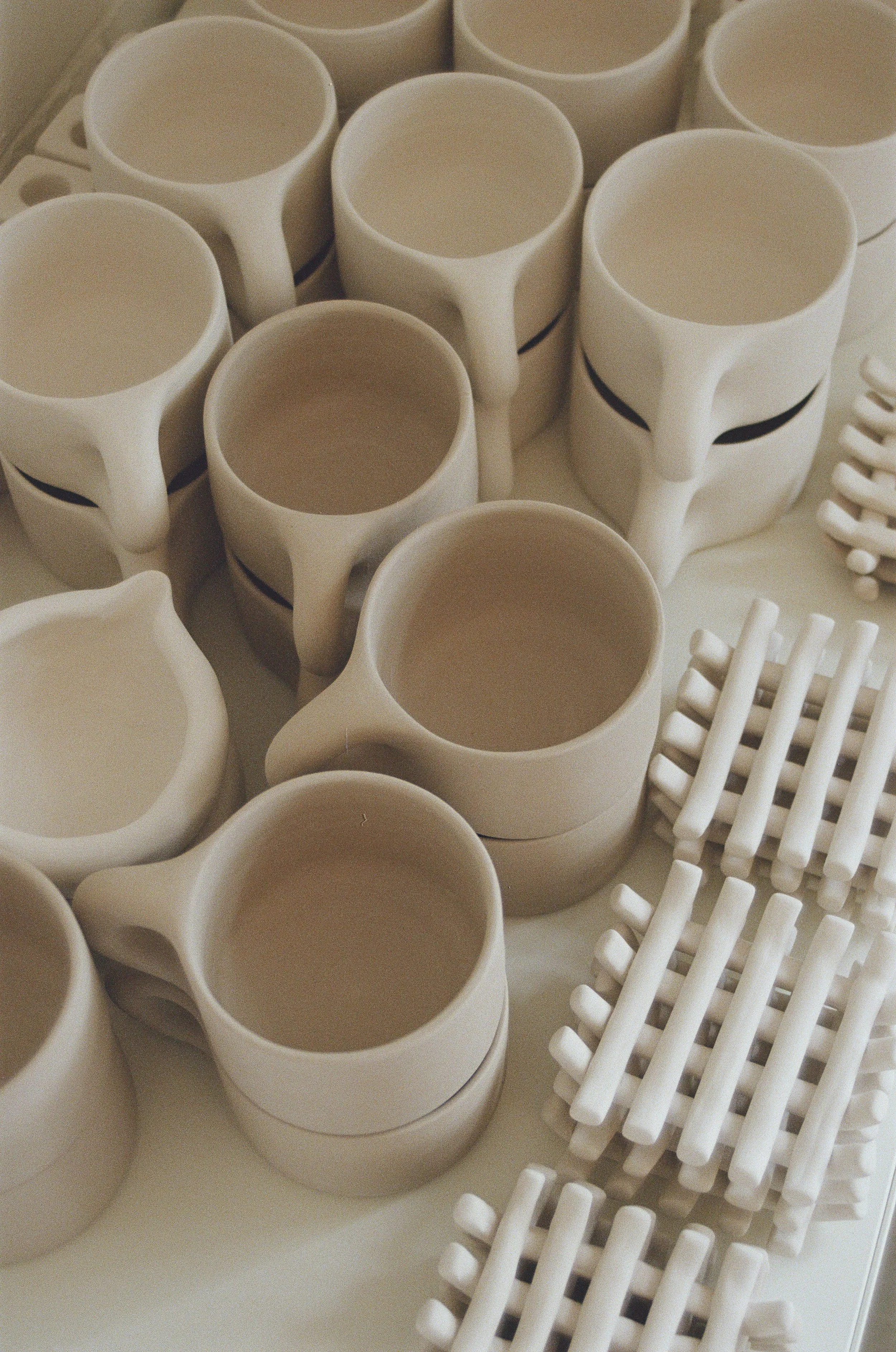 Jedda Clay’s popular PJ Mugs and Soap Dishes, stacked and waiting out their drying process.