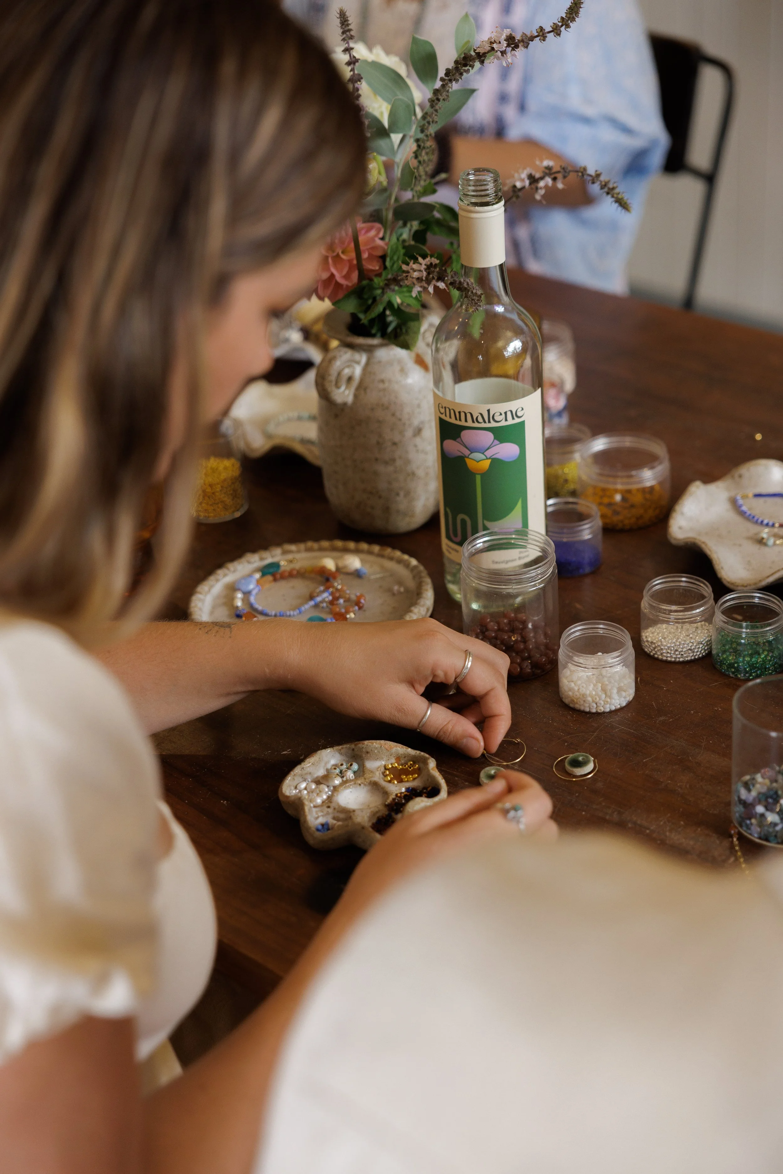 Guests will spend two hours designing and assembling their own pieces—earrings, necklaces, bracelets, anklets—while wine is poured, a cheese platter circulates, and jazz fills the room. Lauren will move through the space, offering guidance when (and if!) you need it.