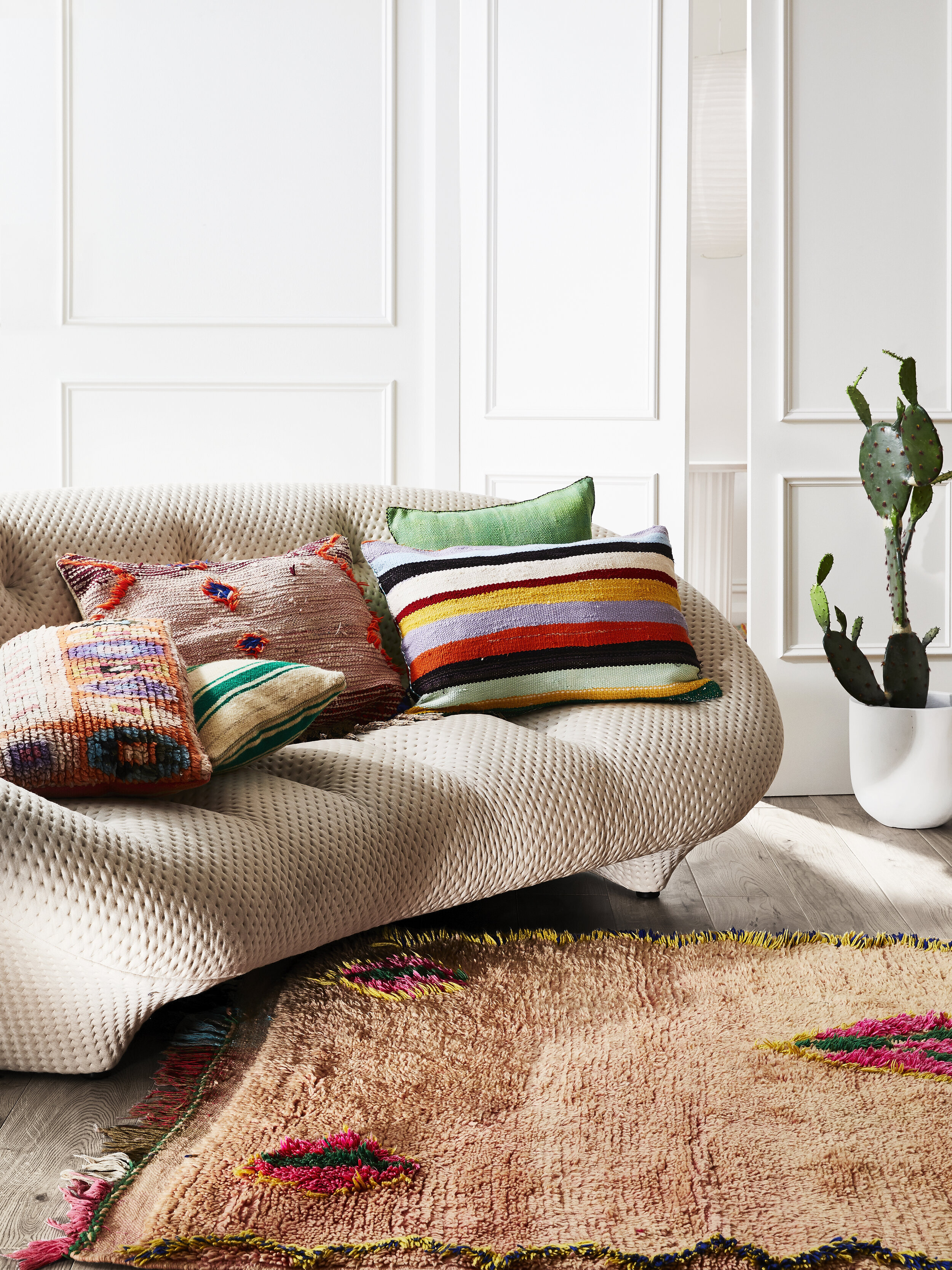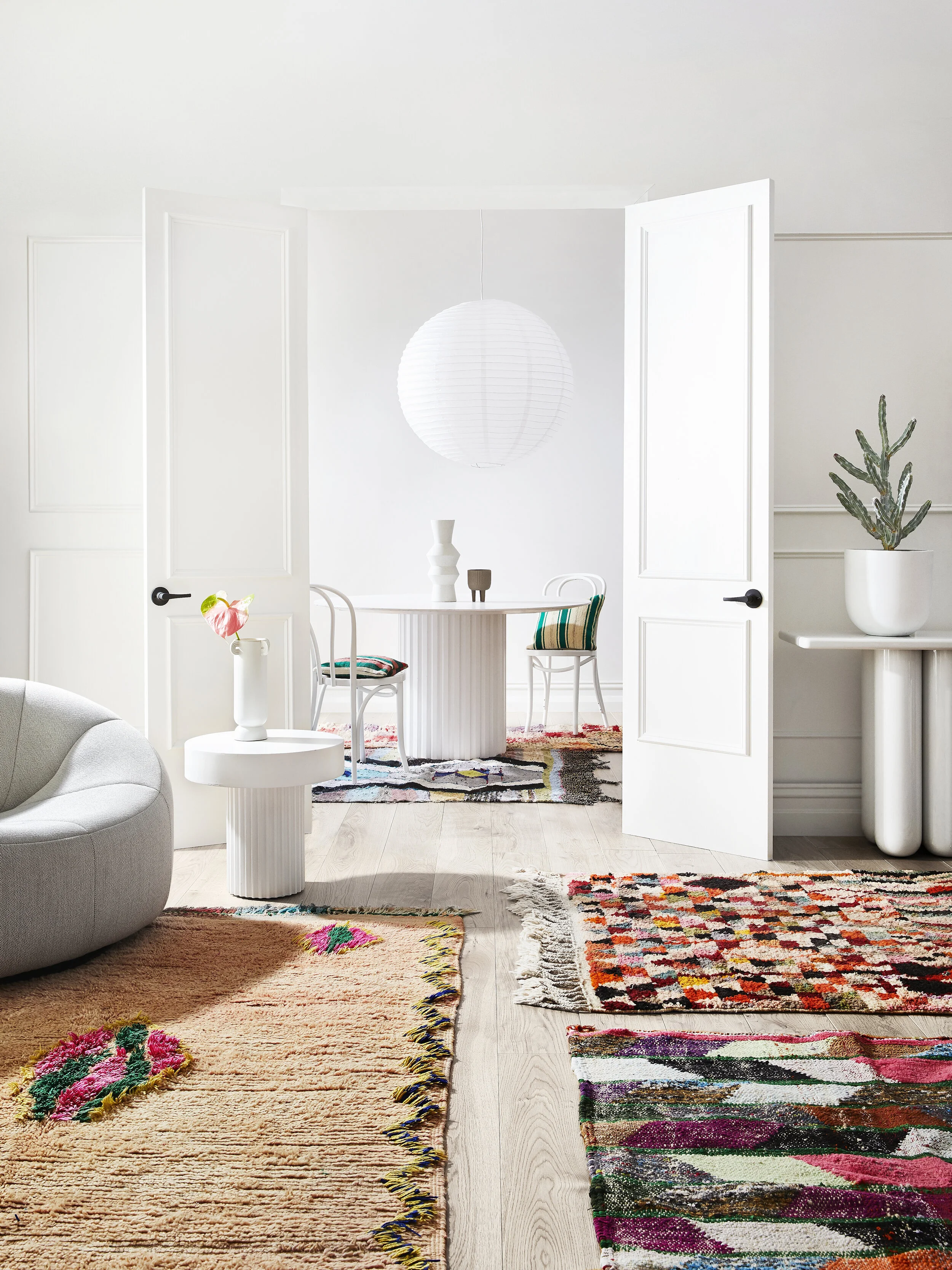 Moroccan Treasures includes a distinctive collection of rugs, textiles, earthenware and a small range of clothing. Each piece is handmade and sourced from artisans in Morocco, with a considered approach to its maker and origin. The common thread carried out throughout the range is the joyous approach the makers have applied to colour and how it can be applied to any interior. “Colour can work wonders in a space, setting the mood and tone — it's all about knowing when to turn the dial up or down and learning companion colours so it feels considered and not a chaotic mess,” shares Julia.
