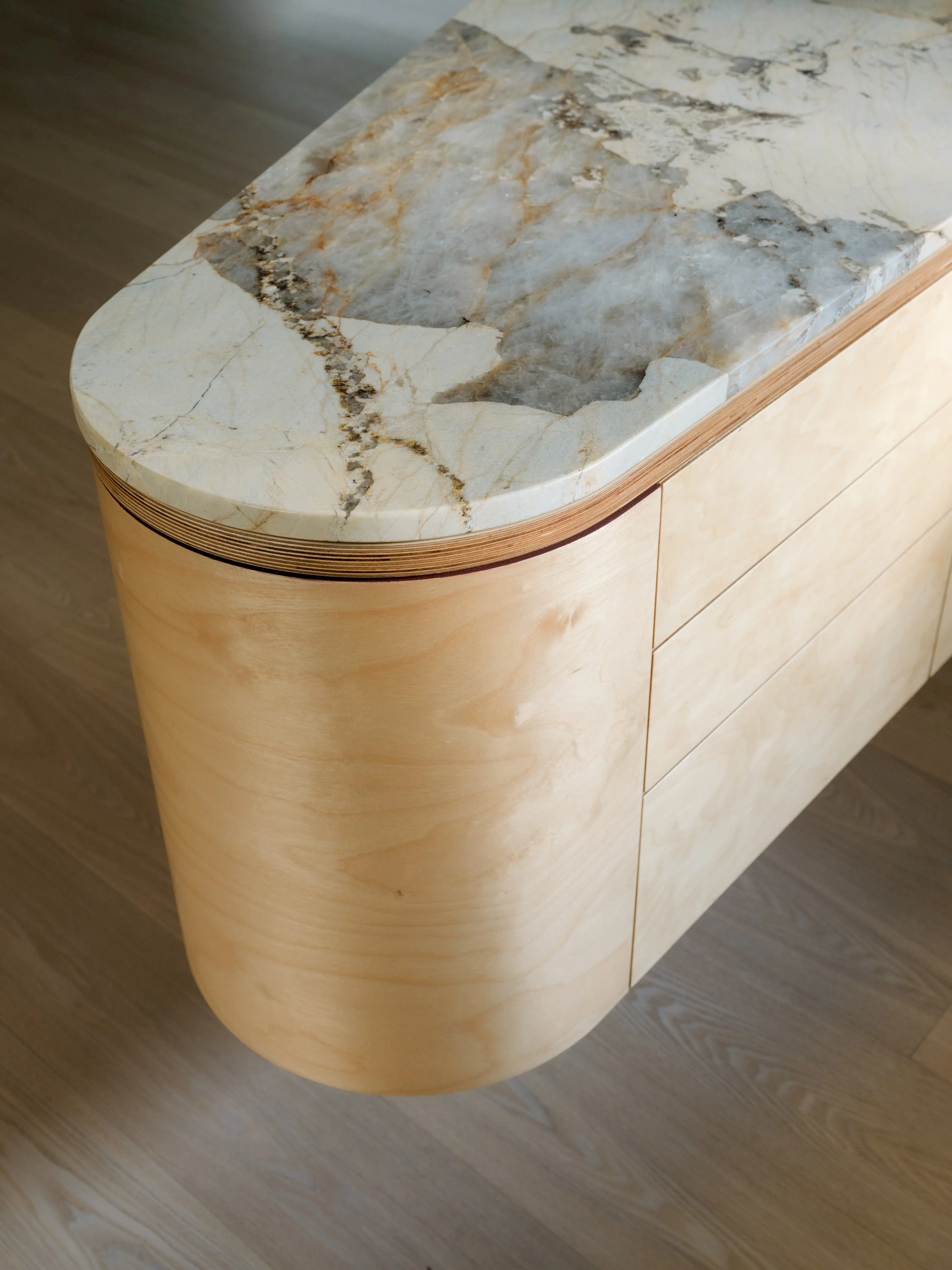 The palette within the apartment is calming and muted – blonde timber floorboards feature against a stone plywood in the kitchen, mirrors open up the space and highlight the neutral tones throughout. The only exception is a pop of colour in the study nook–where a furniture grade lino in olive was applied, ‘to give a bit of drama to the nook,’ explains Jack.