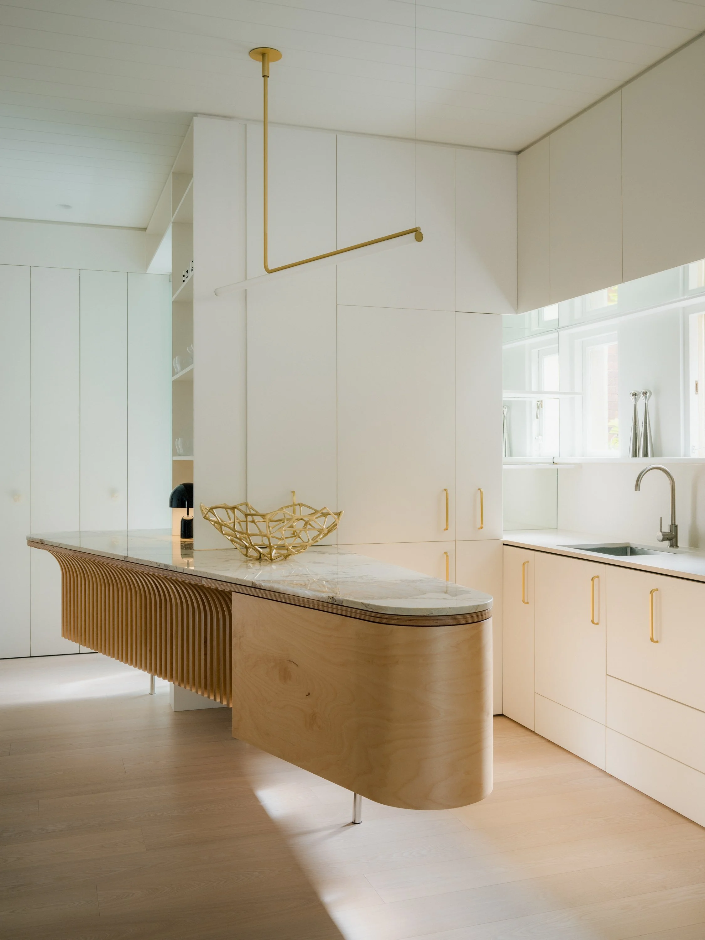 ‘The kitchen floating island is quite a feature – it spans between three spaces, from the kitchen to the entry and into the bathroom,’ says Jack Chen.