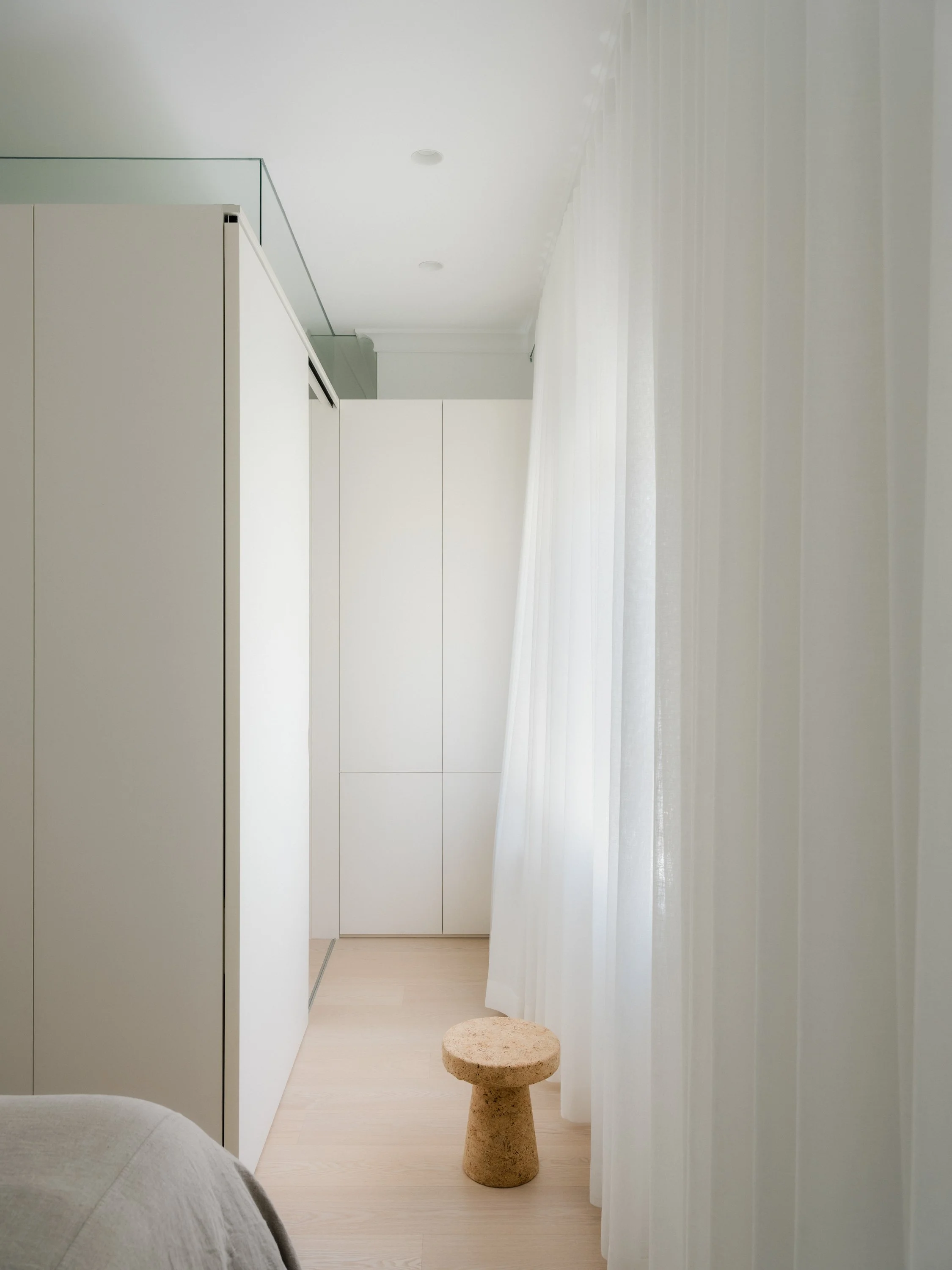 Renovation challenges to overcome included opening up the very compartmentalised apartment, which was previously incredibly dark due to poorly used windows that allowed limited sunlight to enter the spaces. ‘The solution we adopted was to remove the internal dividing walls in the living and bedroom space and in the bedrooms we replaced the wall with a wardrobe unit, which is not full height – this allows the homeowners to see the ceiling plane and gives the illusion of a larger space,’ shares Jack.