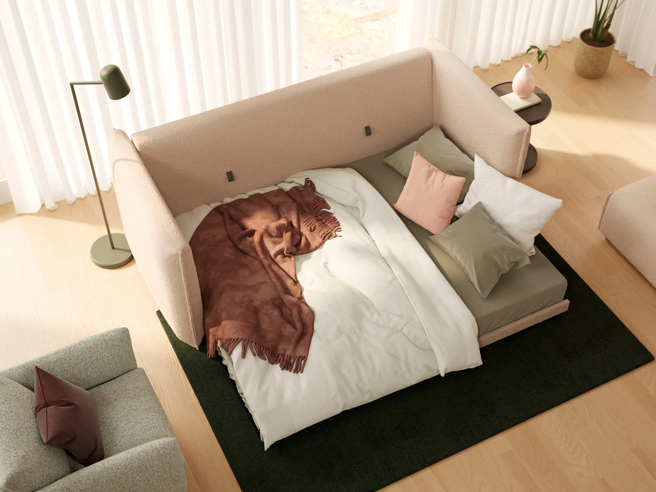 Switching from sofa to bed is quick and fuss-free. One pull drops the sofa to a queen-size platform—no bars, no springs—topped with a 15cm Kloudcell mattress and a washable topper. It reads more like a considered sleep system than a fold-out, borrowing comfort logic from Koala’s mattress range to keep guests supported and cool.