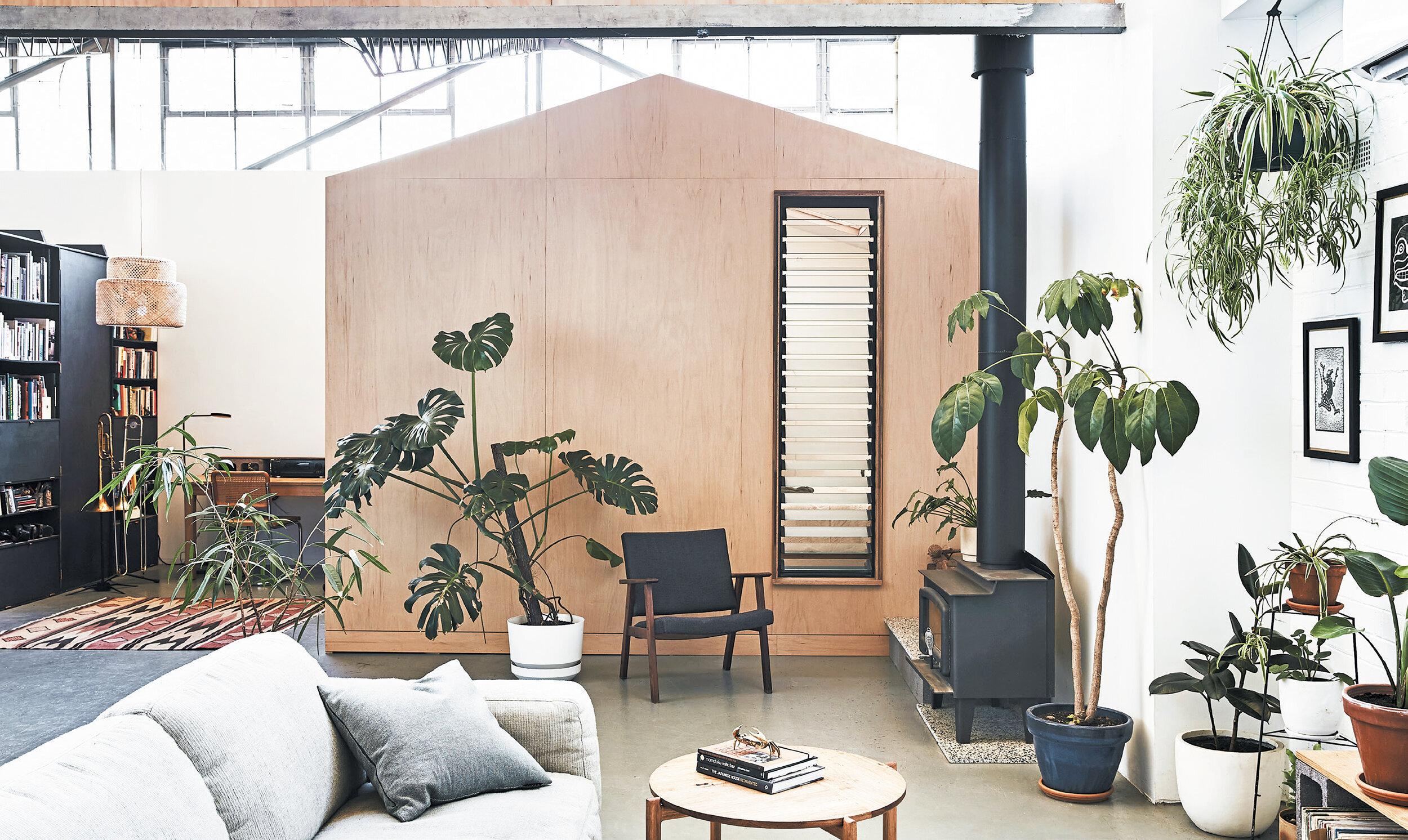 One of Leah Hudson-Smith’s self-built ‘mini houses’ sits within the walls of their rented warehouse home. This design feature, along with their plant collection, adds warmth and cosiness to the otherwise industrial space. Photo - Lilli Thompson.