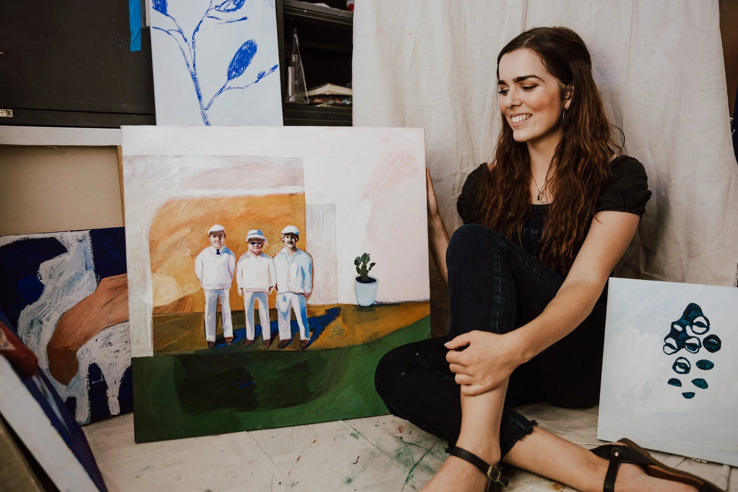 Inviting her Australian audience to connect with her works, Lisa paints recognisable Australian iconography, such as the cattle dog and banksia plants. ‘I include a couple of identifying features in my works, such as a hills hoist, which acts to contextualise the work but remains ambiguous enough that the audience are able to project their own memories of home onto each artwork.’