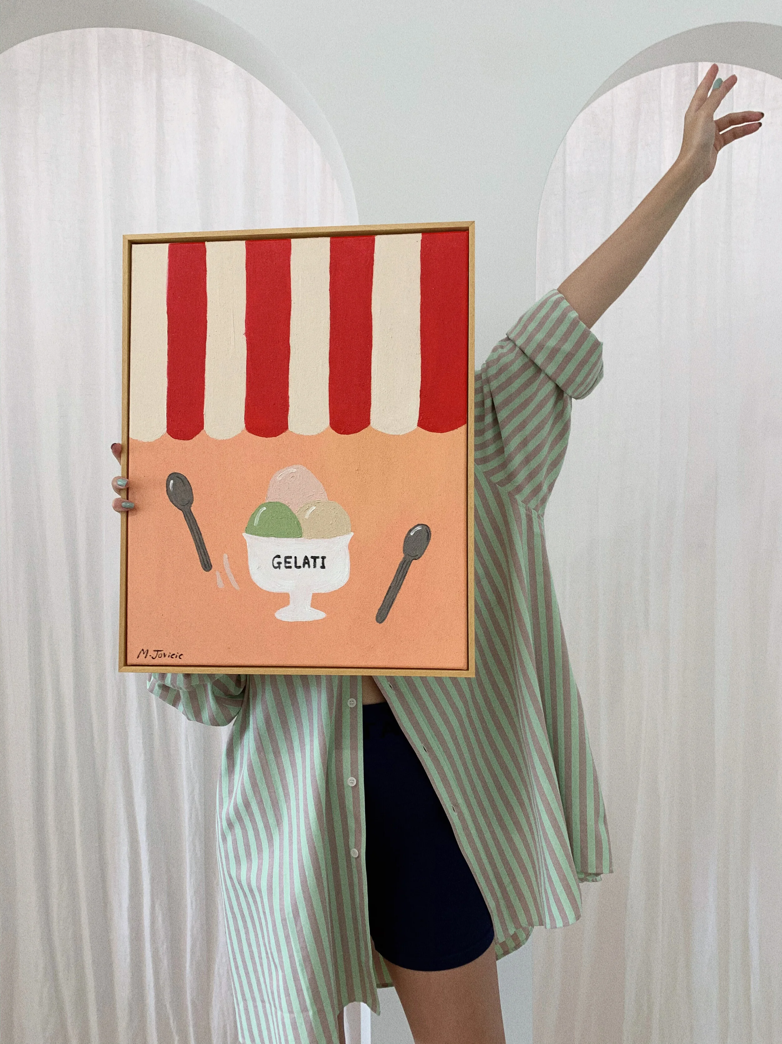 Madeline Dovicic’s paintings transport us to sunny European summer holidays (remember those?!) referencing coloured street food, sardines and gelato stands in shades of pastels.