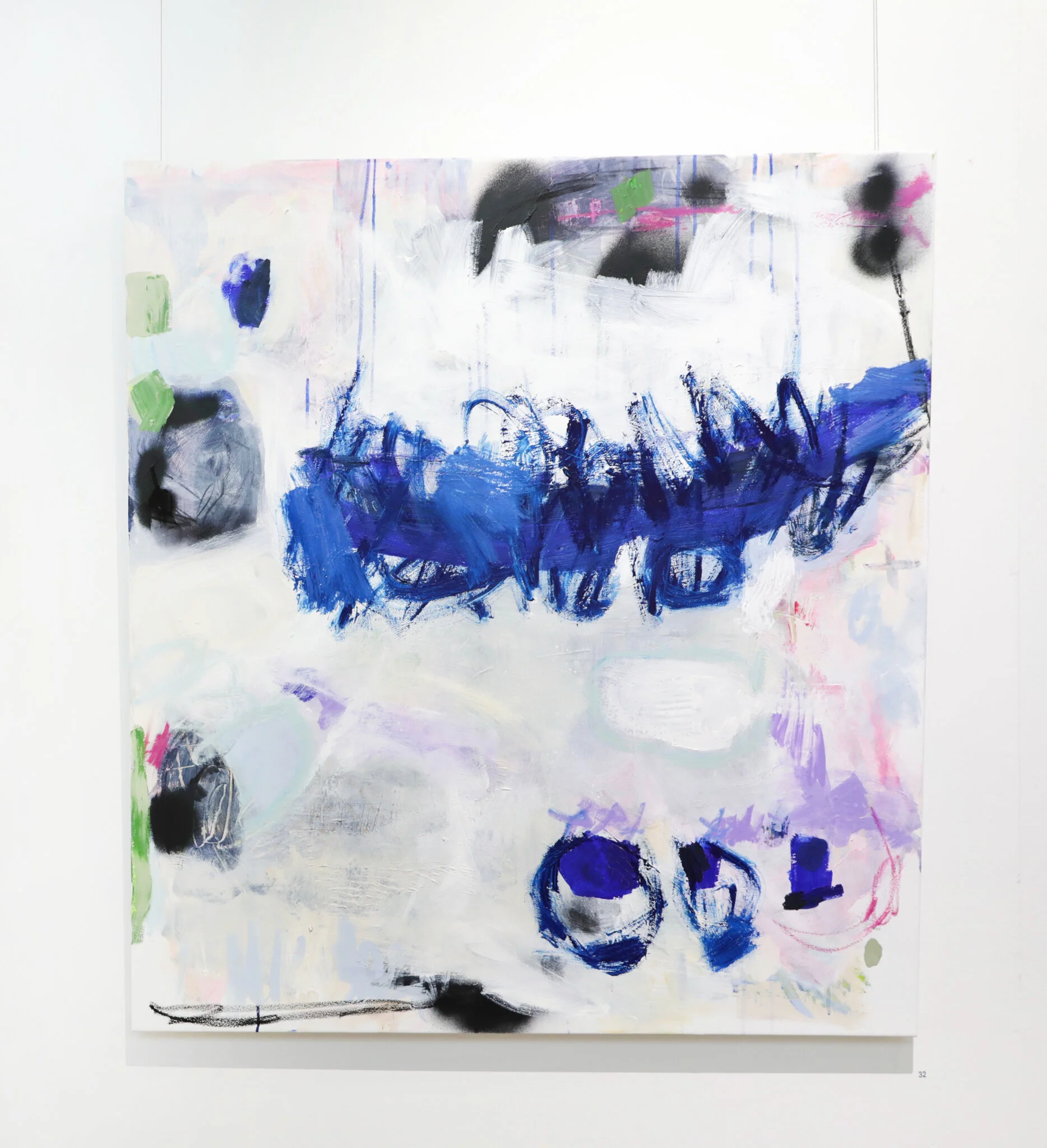 She found herself drawn to the blue and white paint and turned to the canvas to express her feelings for Bigger Than Us. “It has been my most emotional work ever and more personal too,” Marisabel explains. “The orange and red underpainting, probably reflection of my frustration; got taken over by many layers of blue. This happened instinctively. It was almost like by using blue; I was trying to heal and calm my unsettled soul.”